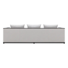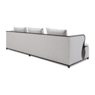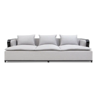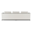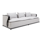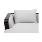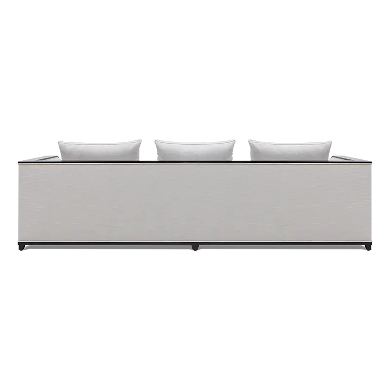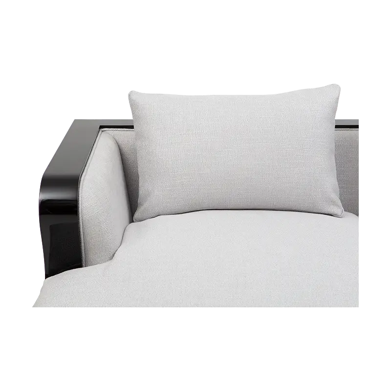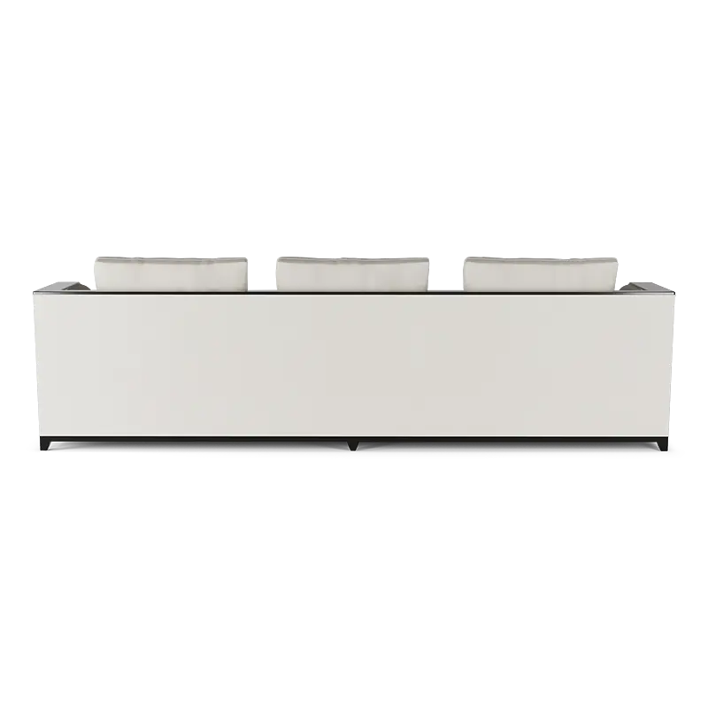 A fabulously chic sofa defined by a carved mahogany ledge that flows gracefully along the arms and continues across the full length of the top surface, creating a striking and seamless design.