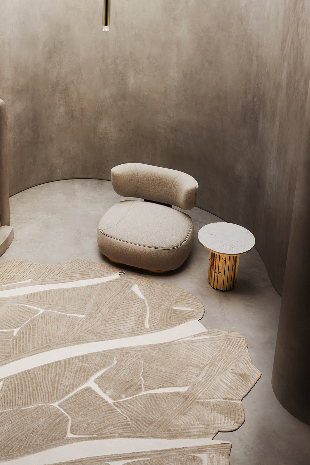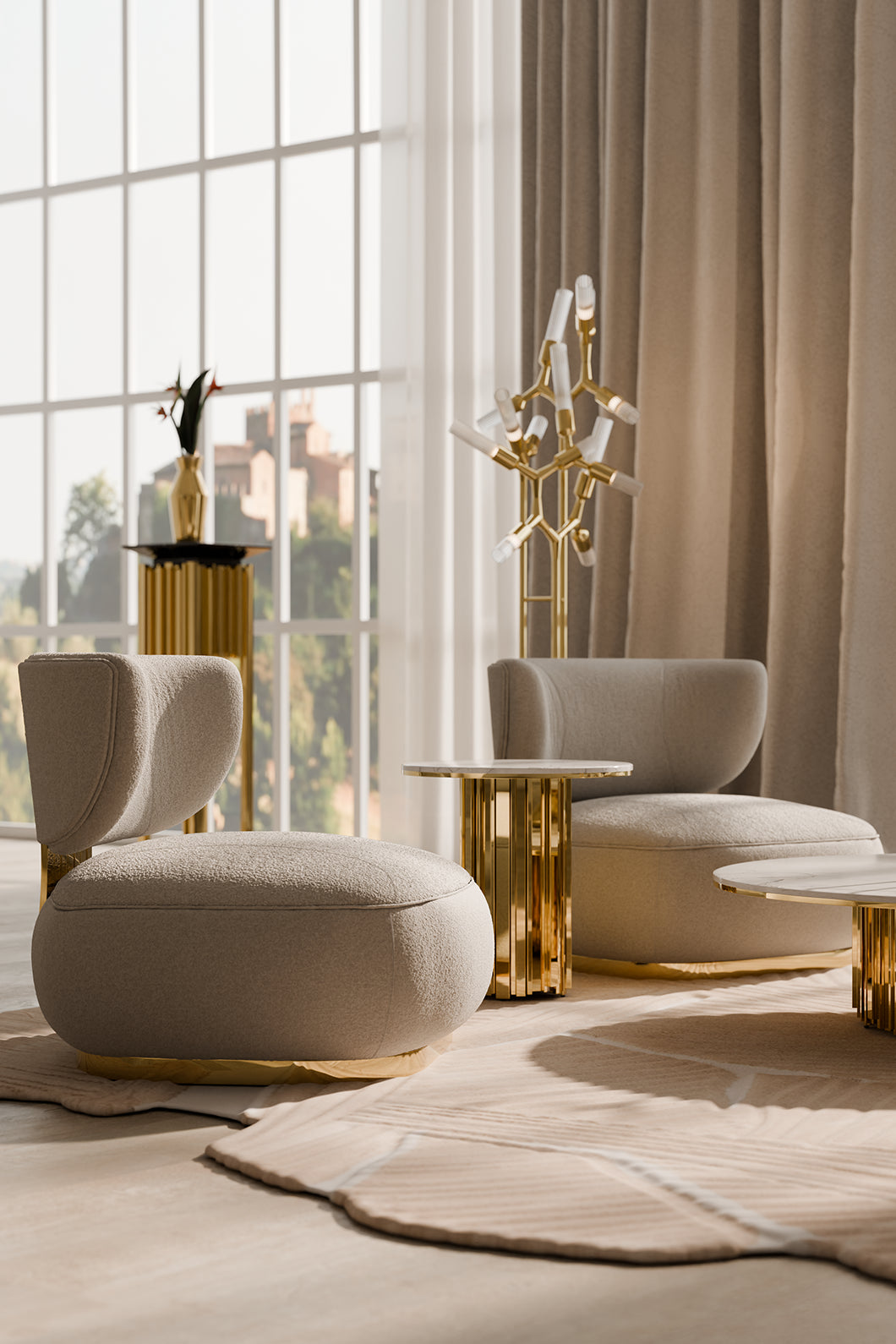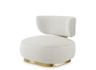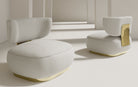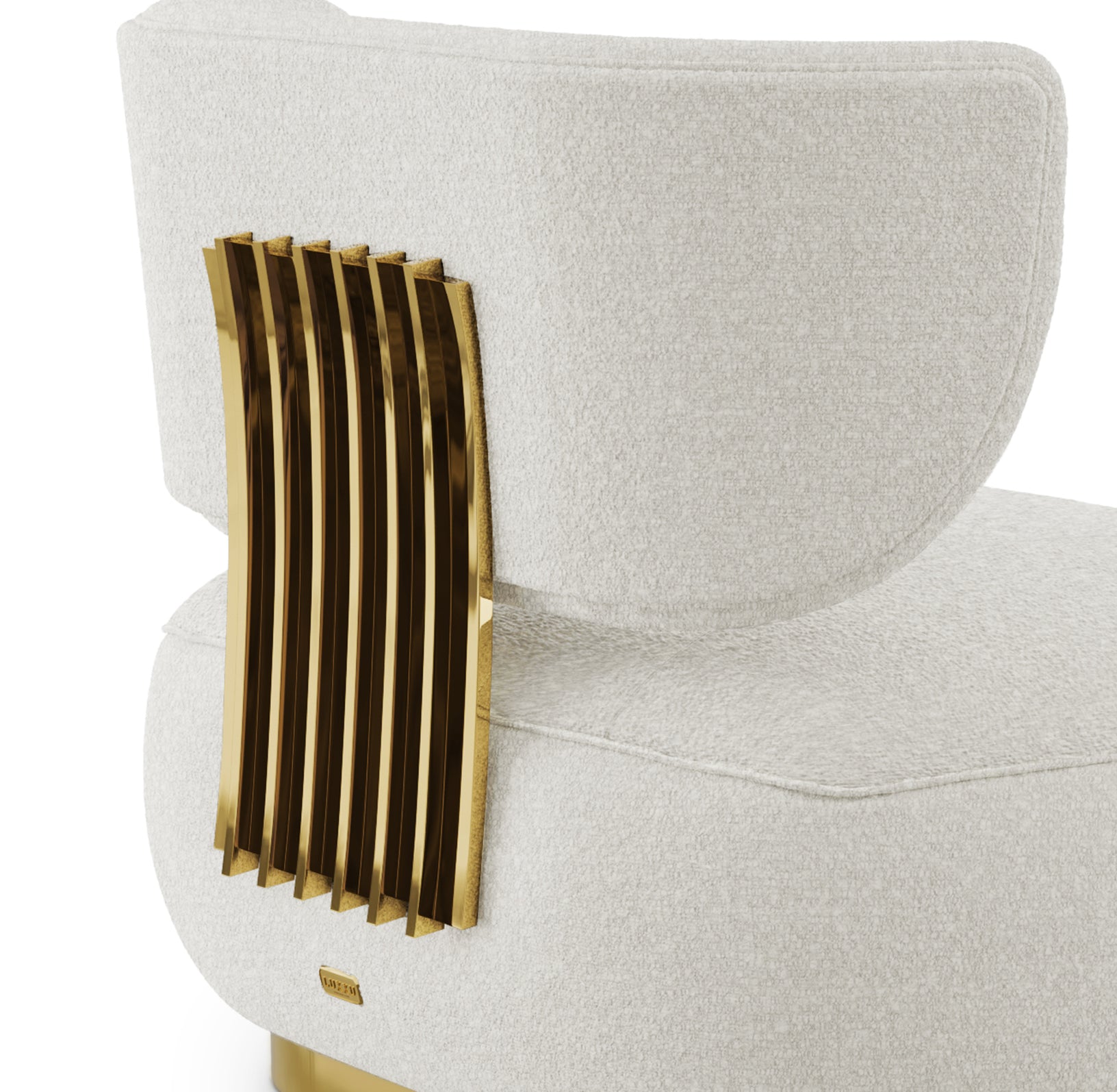 The Talie Single Sofa displays a voluptuous profile that offers extra comfort and style. This exclusive piece is upholstered in Monet Pearl fabric. Its backrest is slightly curved for added aesthetics and attached to a golden metallic support reminiscent of the mid-century modern era.
