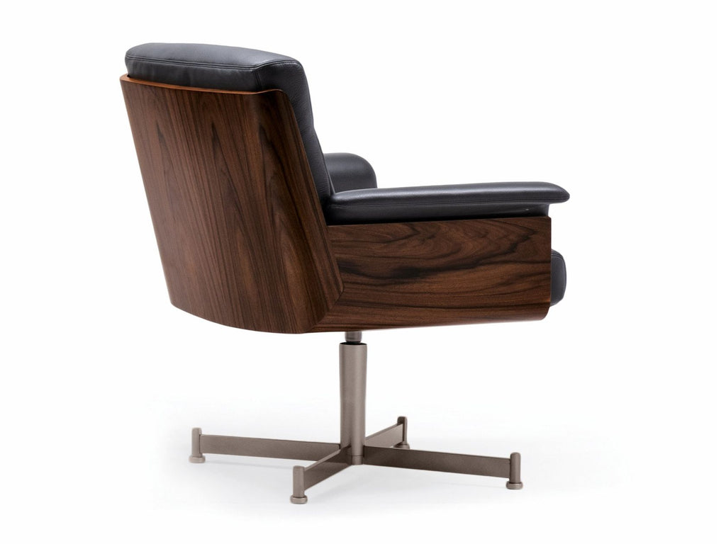 Alongside an Executive armchair on wheels, with high backrest and a five-spoke base in Bronze-coloured varnished steel – a 360° swivel base with no return mechanism, but with height and rocker adjustment mechanisms – four more armchairs with lower backrest are available: an armchair with the same characteristics of the Executive armchair, but smaller; an armchair with a 360° swivel base composed of four spokes and feet, with return mechanism; a lounge armchair with legs in aluminium and, finally, a version of the same piece that is 10 cm taller, ideal for setting beside a table or a desk.