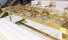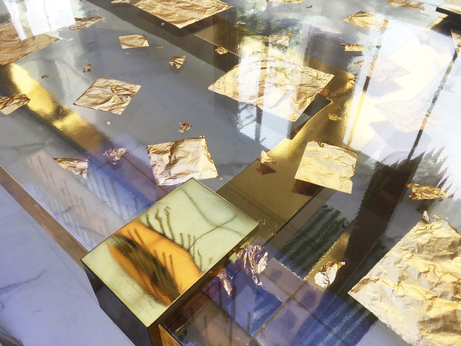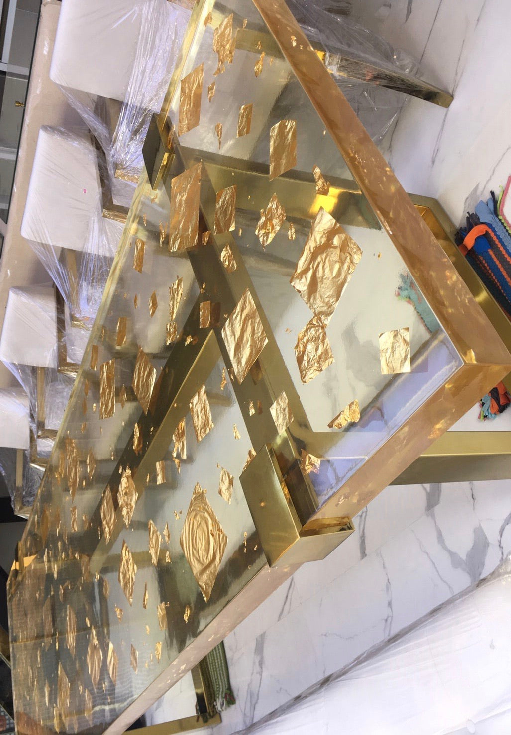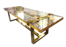Celebrating the definition of elegance and sheer luxury, this stunning contemporary long table is delicately made with 24K gold leaf inlay enveloped in epoxy resin, beautifully combined with exquisite Brass base. Each of these luxury epoxy table is meticulously made by hand, and have a unique character all their own – making each a one-of-a-kind piece.