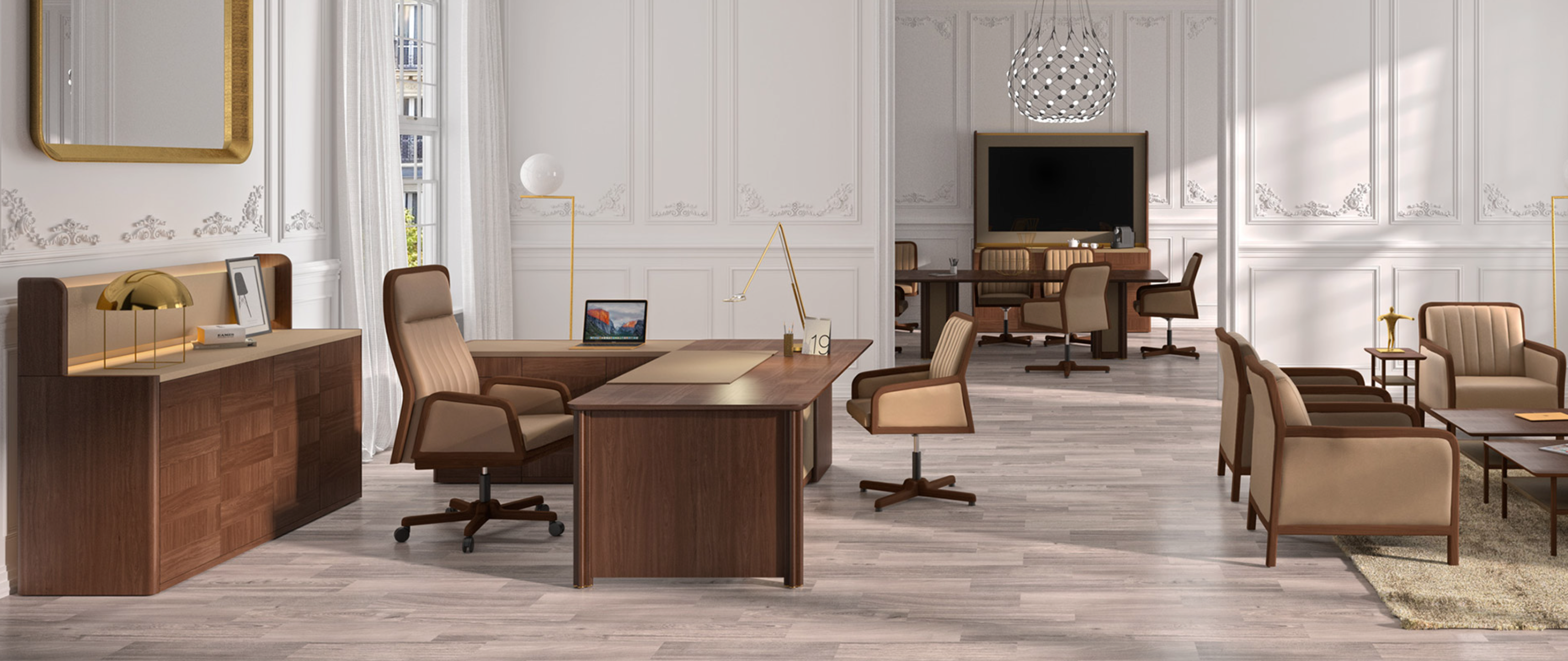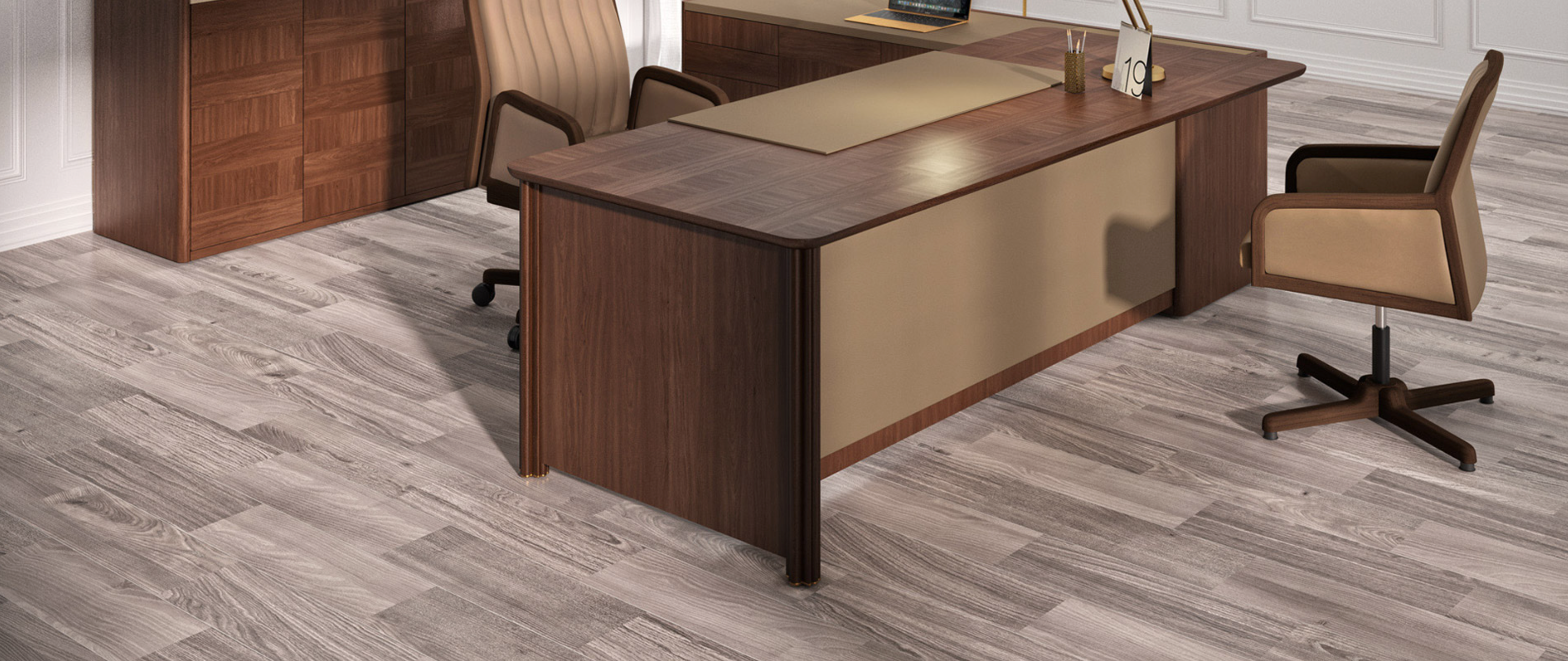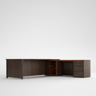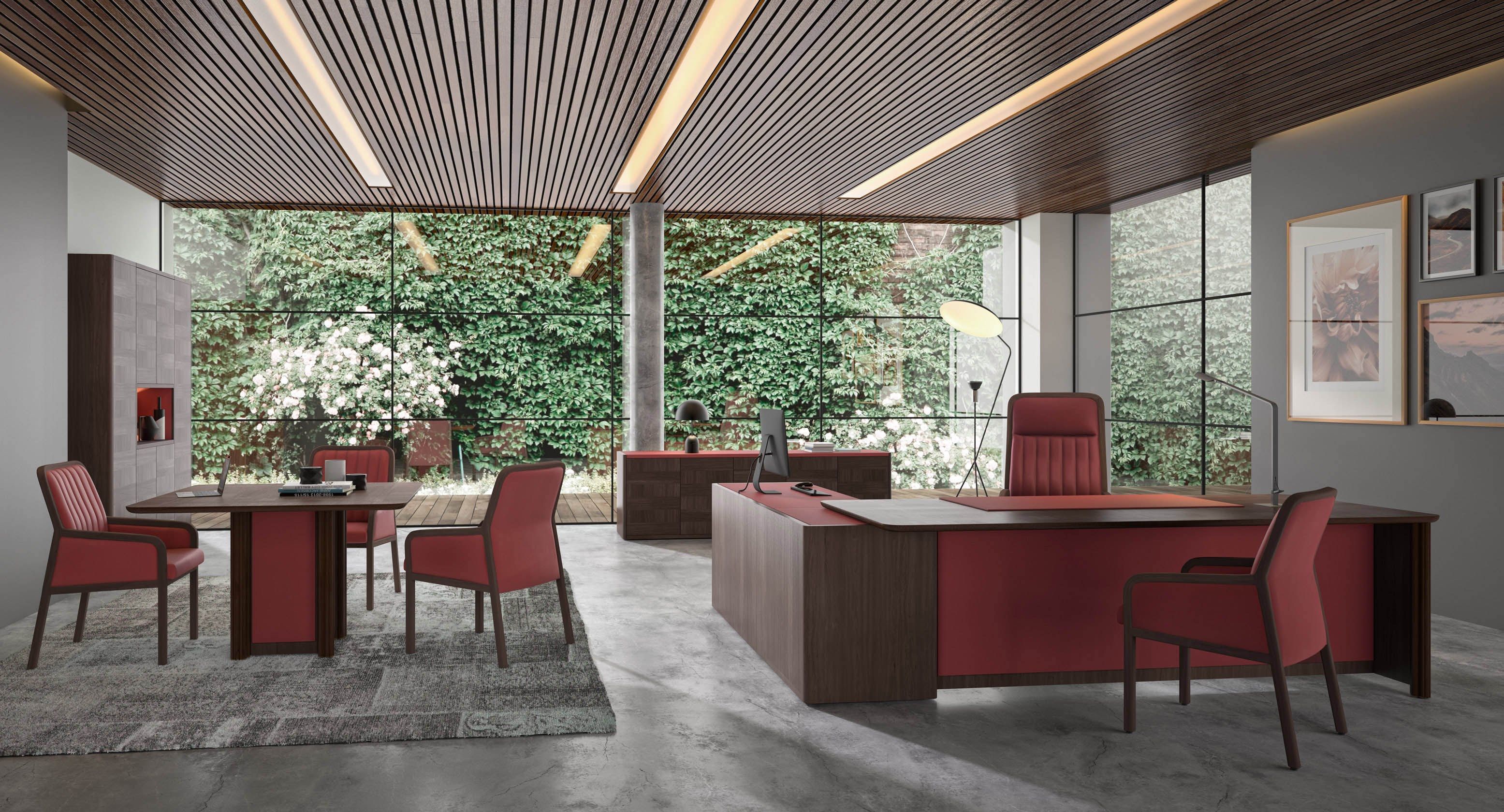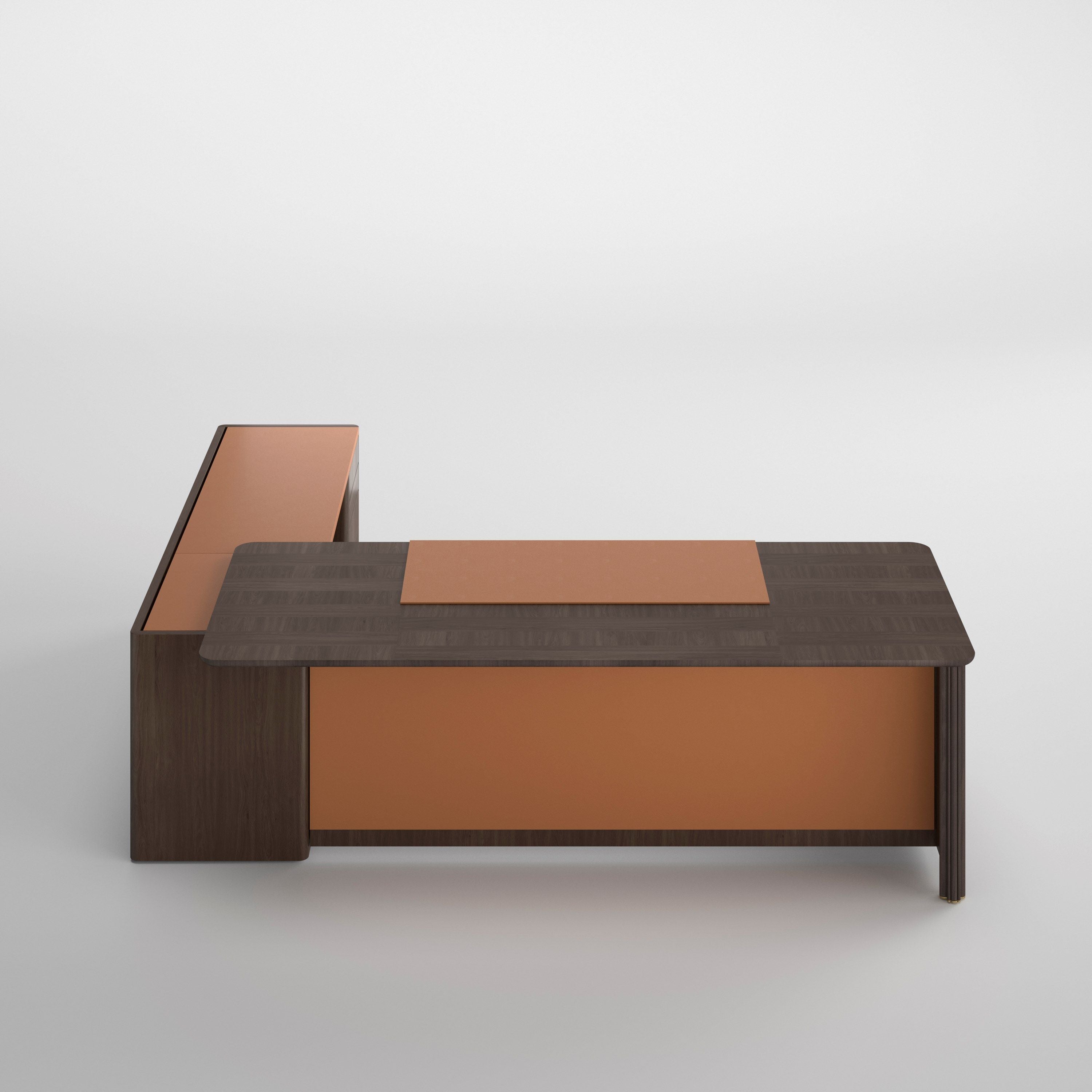 Artdeco is a directional table with optional leather desk pad. Full upholstered modesty panel. Available with right or left sideboard with embedded leather lid.