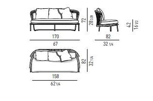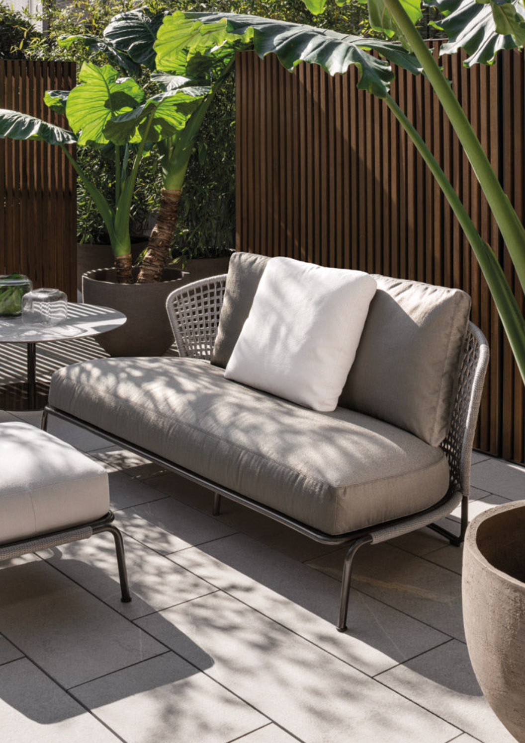The Aston “Cord” Outdoor collection comes with a pewter colour polyester-painted metal frame specially treated for exterior use, as are the padded cushions, which are covered in waterproof fabric. The seat back is in a special braided 7 mm diameter polypropylene cord, available in the following colour variations: Light Gray, Dark Brown, Sand, Sunflower, Khaki Green and Rust, a perfect match for the fabrics in the Art Lifescape 02 textile collection and the shade of Alison “dark brown” outdoor. The painted metal frame is finished with a special polyester paint for exterior use in Pewter colour and the seat back is in a special braided polypropylene cord, available in two colour variations: light grey and dark brown. The seats feature an exclusive Minotti Studio laser-cut geometric design. Inner padding of the cushions is in highly durable expanded polyurethane covered in water repellent fibre.
