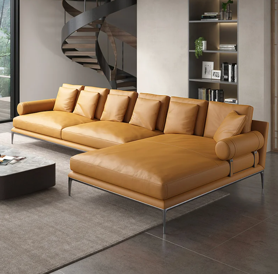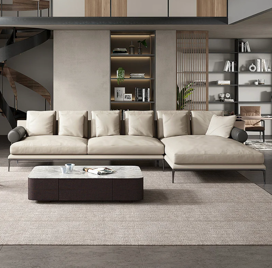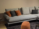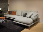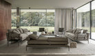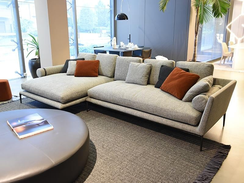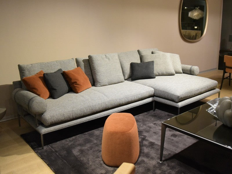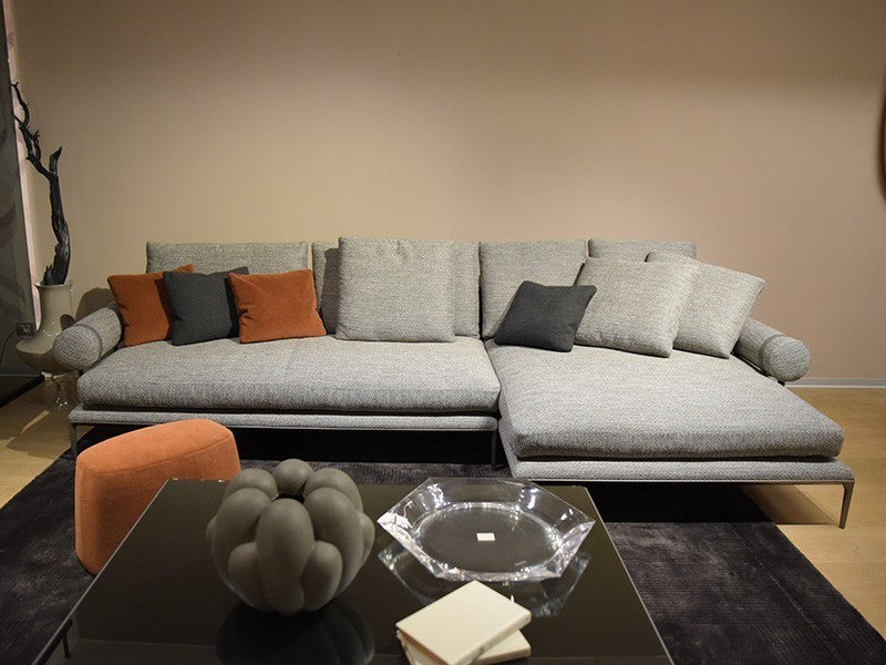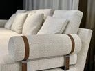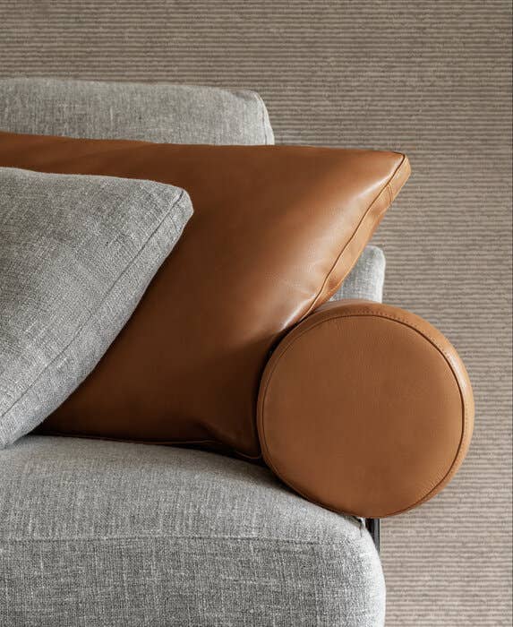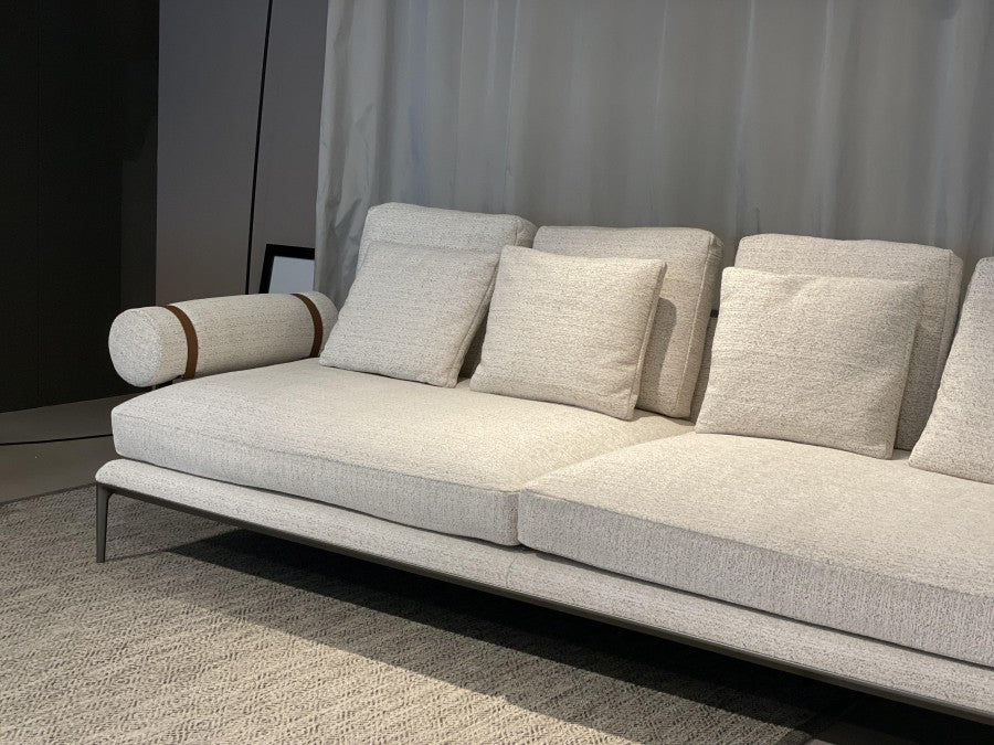 Atoll is a refined expression of a balanced aesthetic form and a decisive contemporary style that is also extremely elegant. The system is built on three basic platforms that are complemented by armrest and backrest elements to form various types of seats: sofas, dormeuses, corner-end modules, single or modular elements with chaise longue and ottomans. The frames have light, slender lines and are applied on high die-cast supports with metal profile emphasising the line between the structure and upholstery. The pieces are given even more character by a supporting element to be placed wherever desired, a bolster in two sizes attached by leather straps to a die-cast structure.