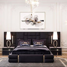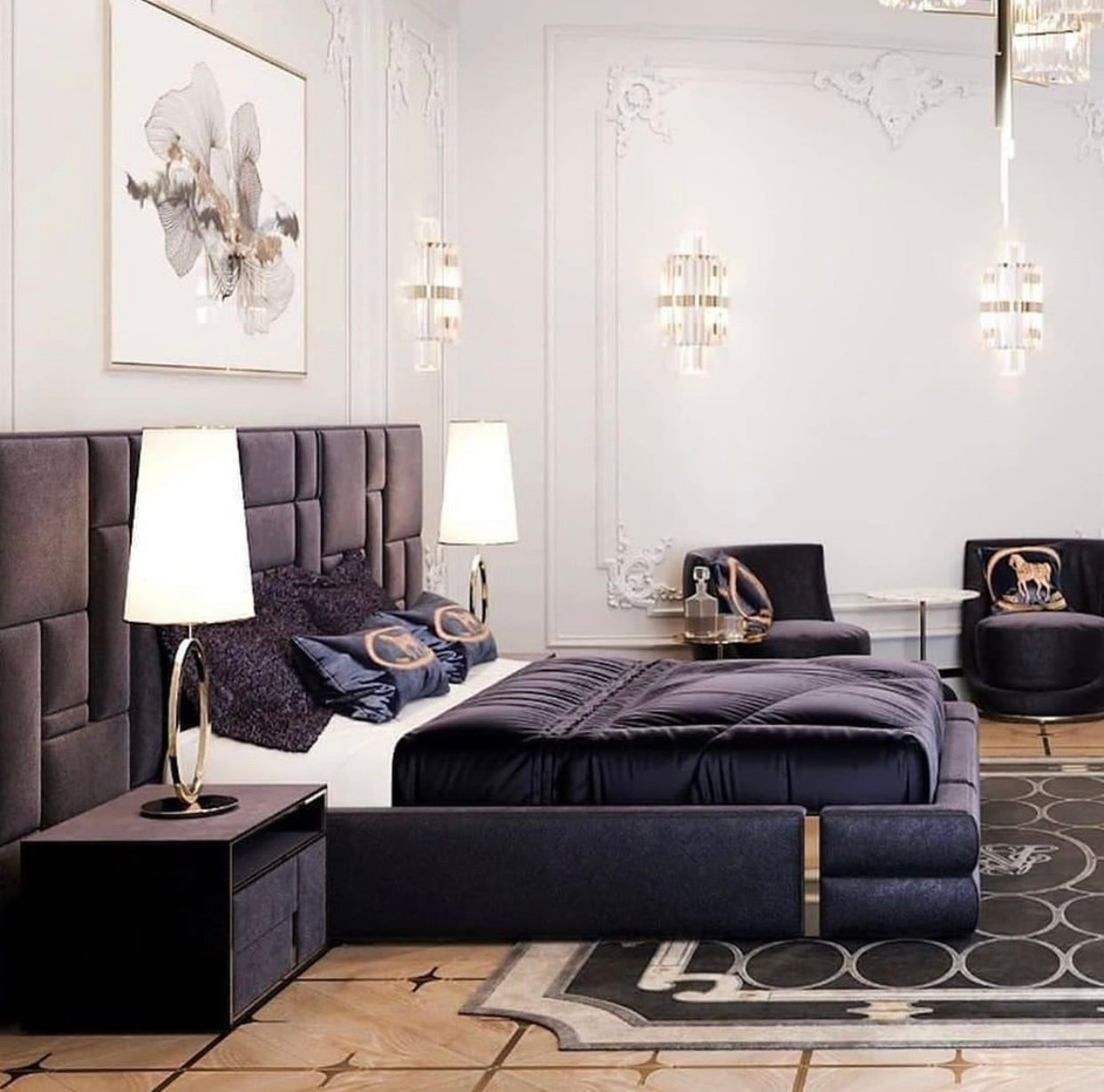 Babylon luxx- Bed & Console Vanity are upholstered in Velvet fabric. Upholstered headboard with geometrical pattern, structure in plywood with slightly padded panels upholstered individually. Plinth and inserts in satinized Brass steel with engraved logo, predisposed for wall fixing. Bed base in plywood padded in polyurethane, made of several elements individually upholstered, decorated with four inserts in satinized Brass. Base in satinized Brass. Wooden slats with 4 corner supports and central bar,in varnished Brass.
