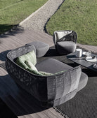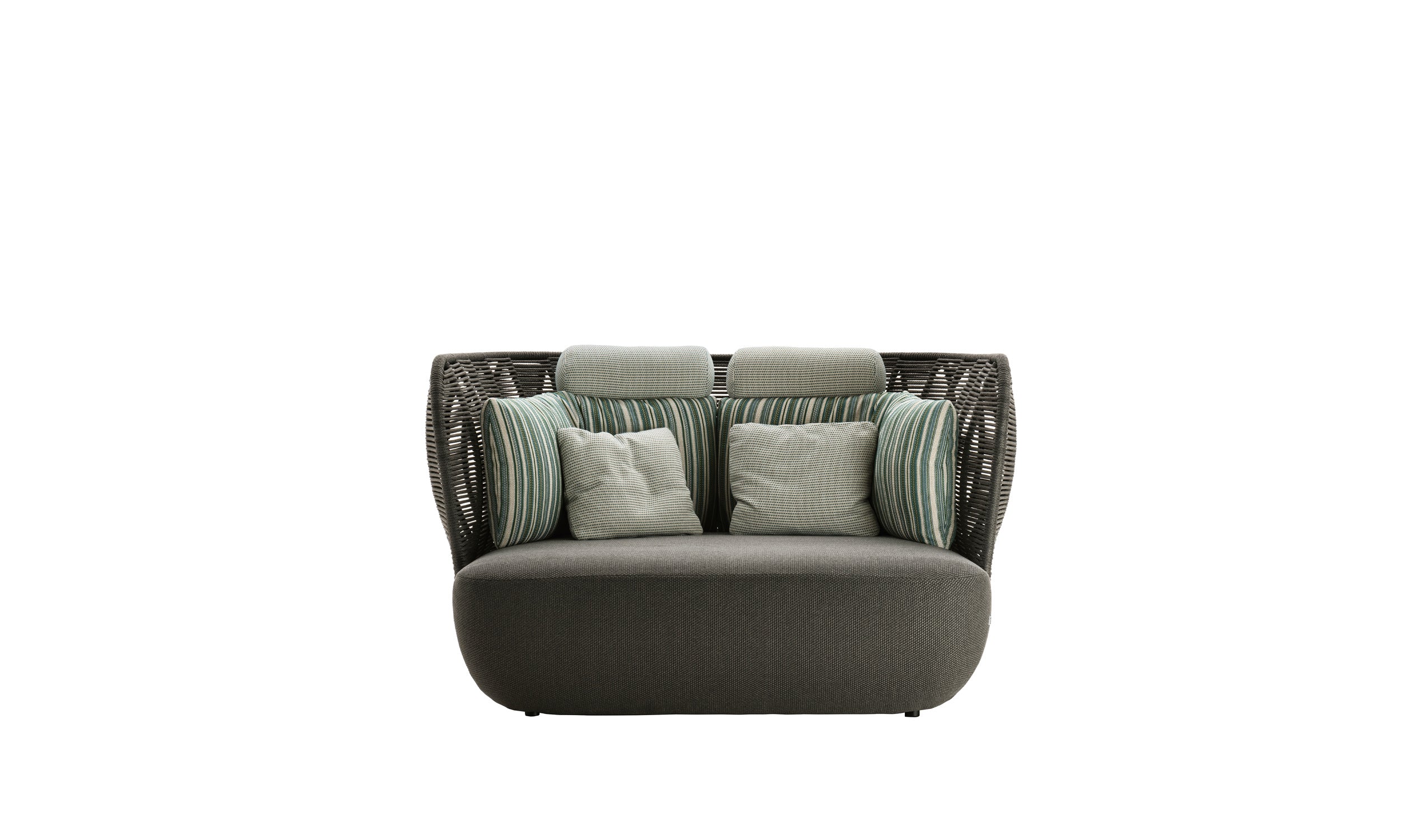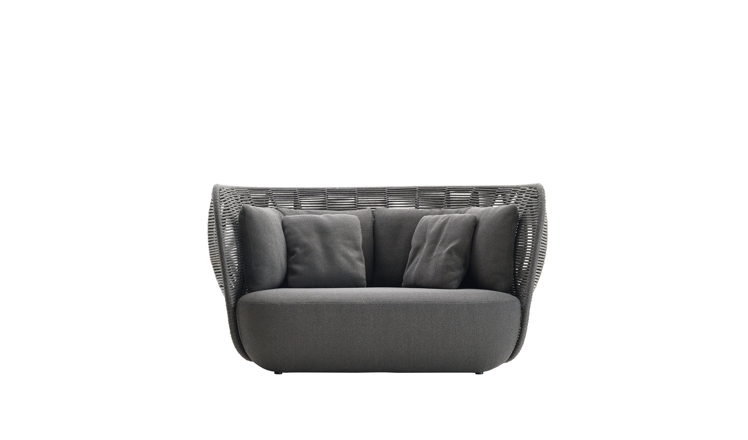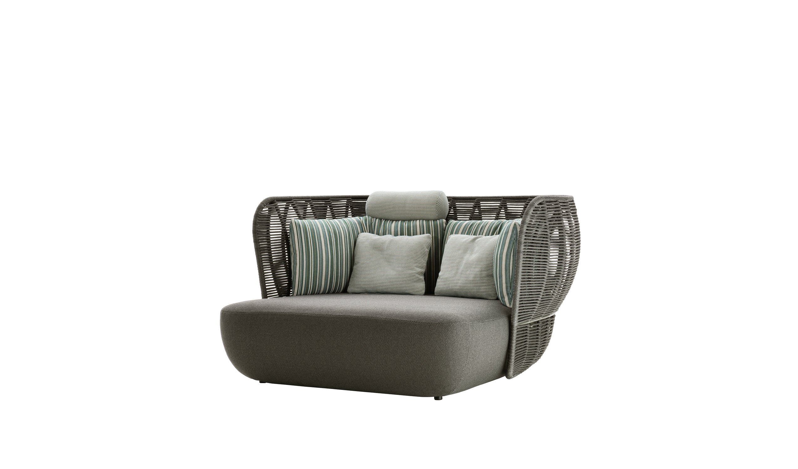 Bay is a sculptural, monolithic collection of braided outdoor furnishings. Enveloping braided volumes are combined with padded rock-like seats and soft cushions that reflect the elegance, comfort and refinement of B&B Italia’s indoor products. Sensually shaped, their double braiding creates air pockets that grant transparency and lightness to the collection.