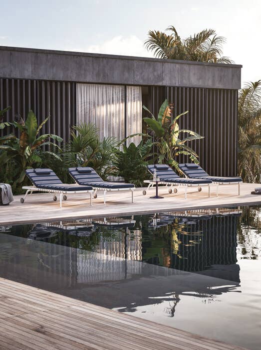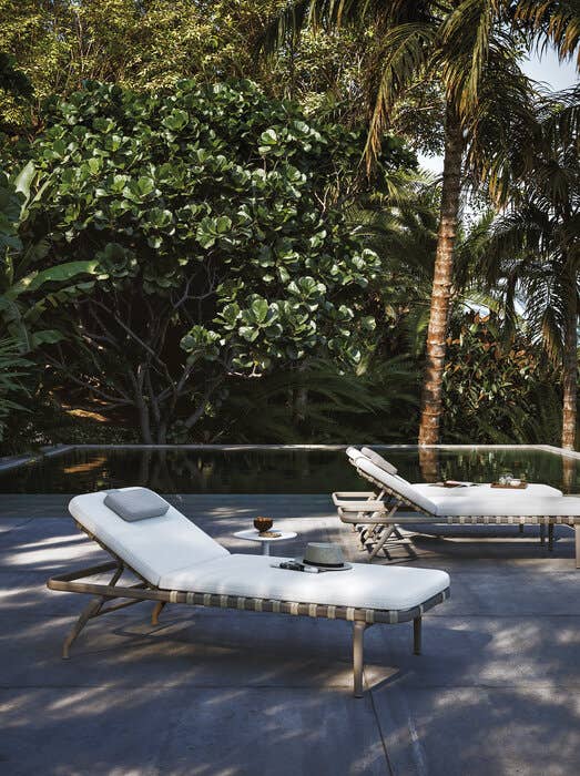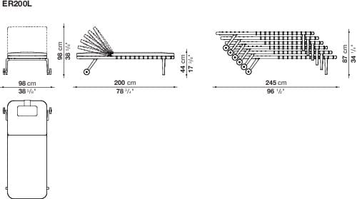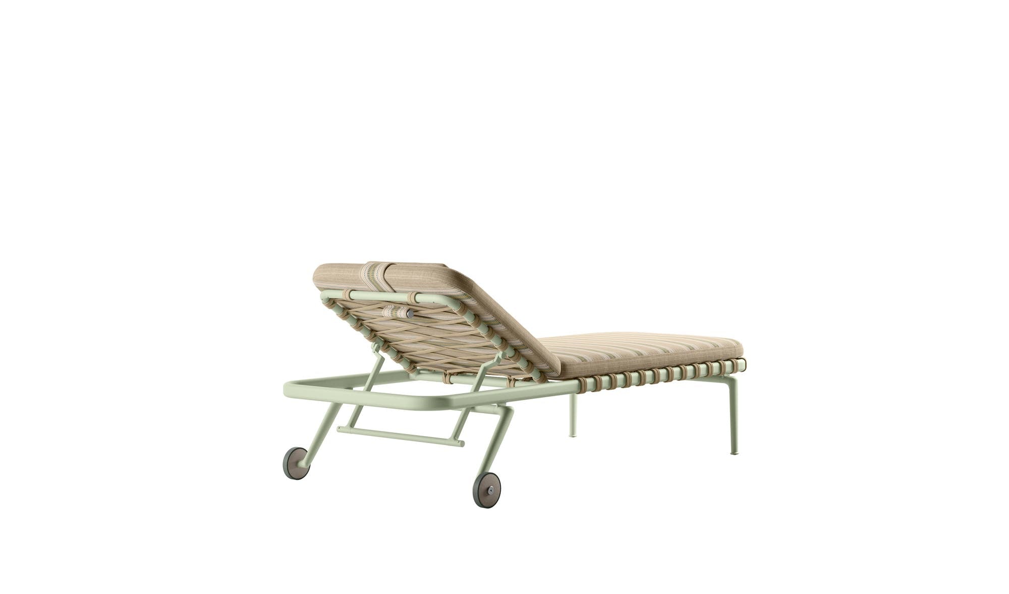 The Erica sunbeds take up the elements that characterize the outdoor seating collection of the same name: the powder-coated die-cast aluminium structure which offers lightness and durability and the interlacing in polypropylene strips reinforced by a high-resistance internal core. Comfort and practicality are guaranteed by the backrest that can be adjusted in different positions, by the padded mattress and by the design that makes them stackable. The wheels they are equipped with allow them to be moved easily.