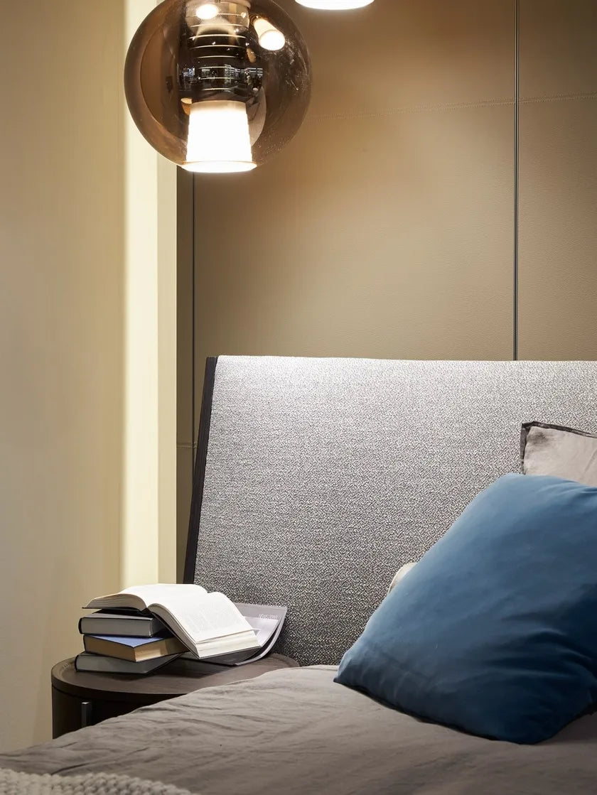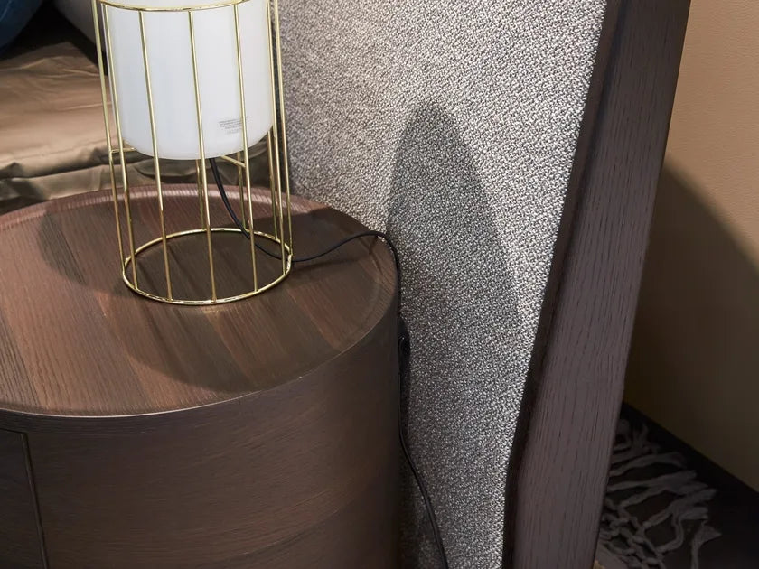 The bed features a refined blend of crafted wood framing and sculpted fabric volumes. Its large winged headboard creates an enveloping feel, paired with a soft and elegant textile base. Wood and fabric are combined with precision, and the entire piece comes with removable covers. Accessories and benches complement the design, making it suitable for modern interiors.