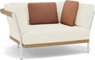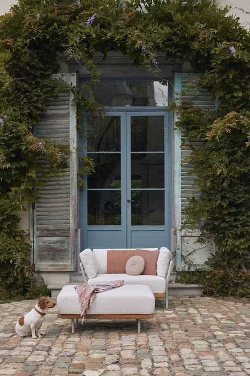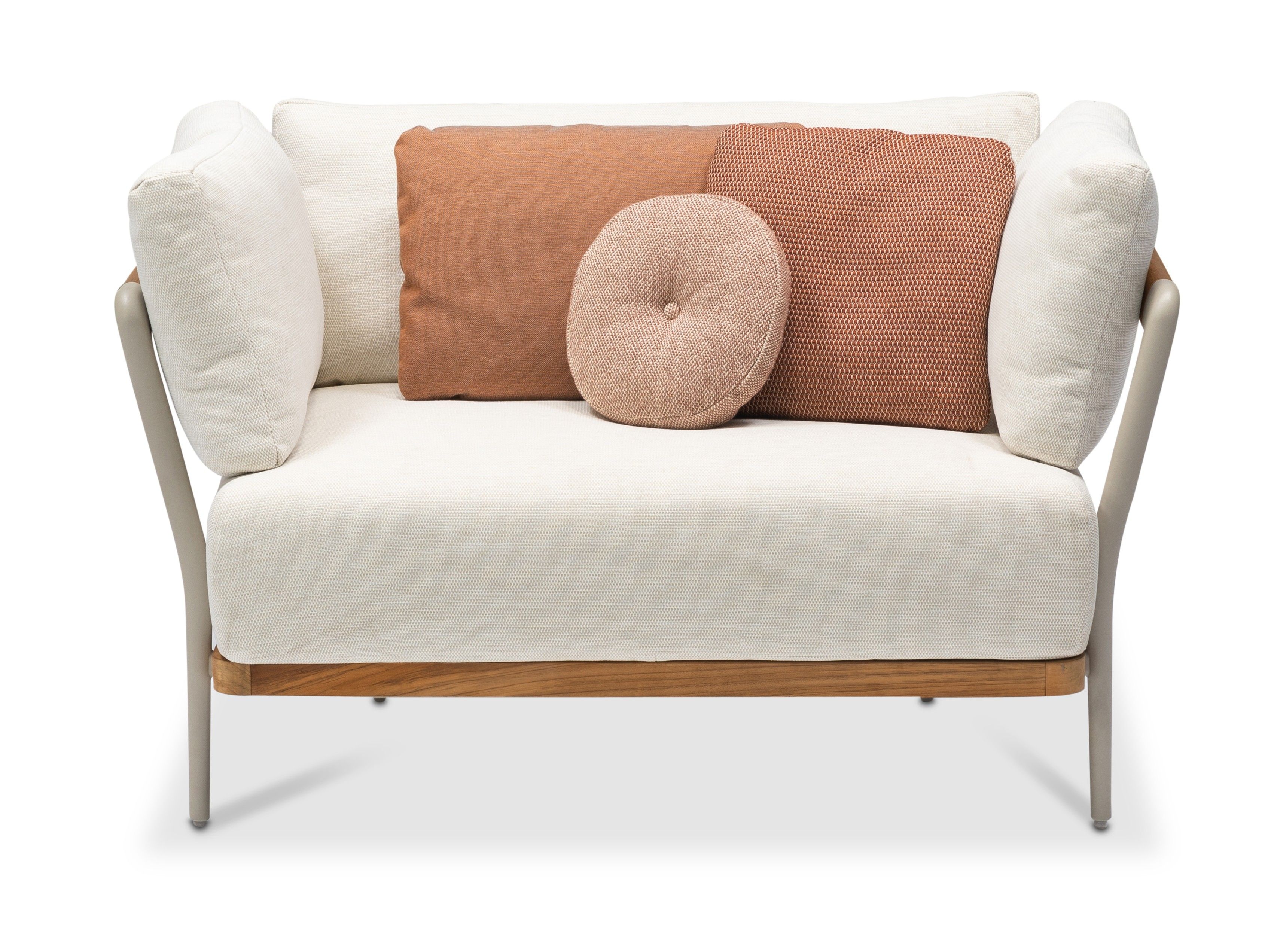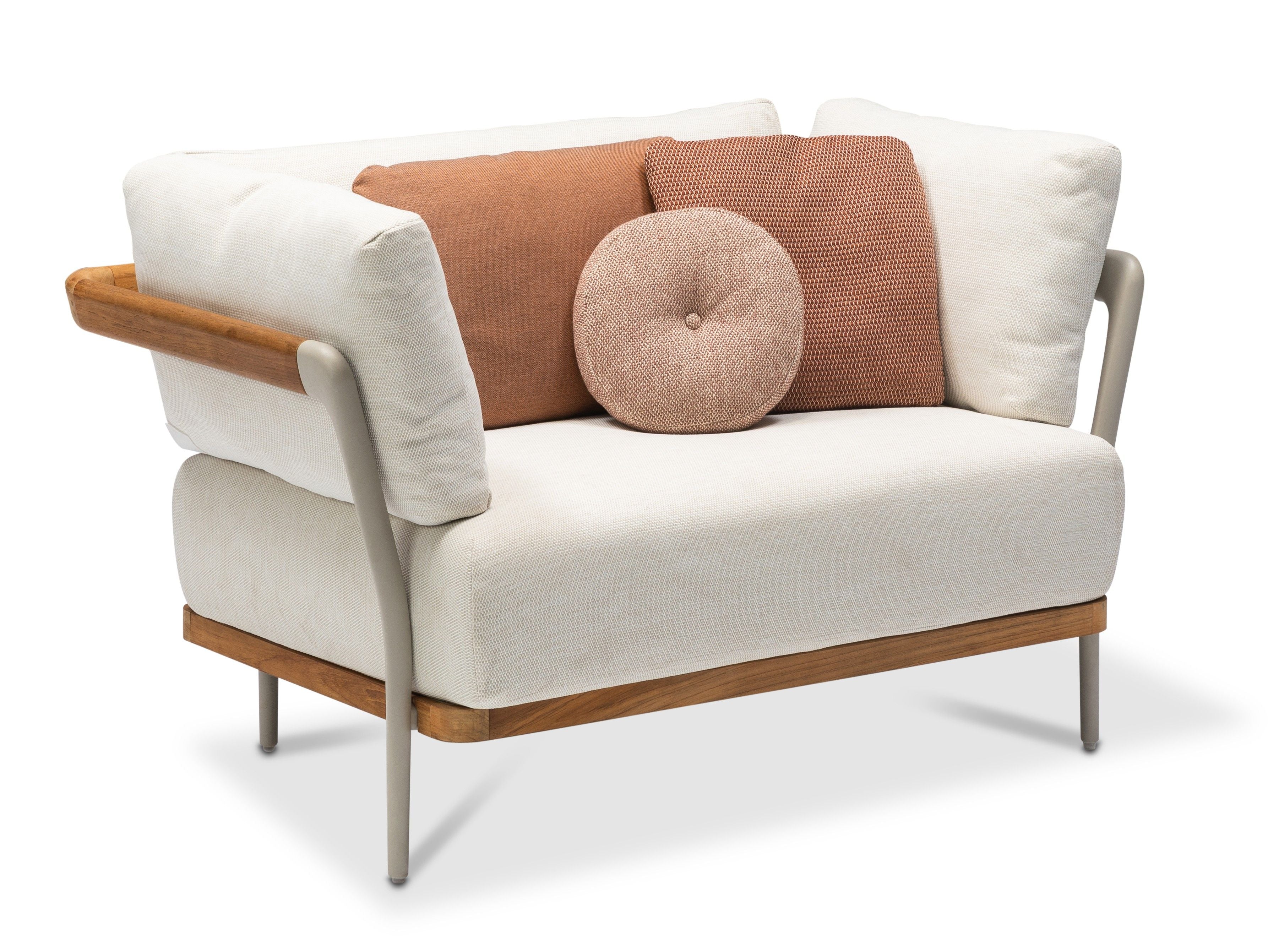 Flex unites a world of contrasts, merging the flexibility and strength of its design. This collection showcases a sleek, elegant aluminum frame paired with the warmth of handcrafted wood, achieving a harmonious balance between old and new. Designed in collaboration with Metrica, Flex combines traditional aesthetics with modern innovation, offering an ambiance of nostalgia and contemporary lightness. It offers two versions: teak natural and teak nero, complemented by soft cushions in warm colors. Flex is a versatile sofa solution, featuring aluminum cast legs, a wooden armrest, and a wood-covered platform, blending materials to evoke strength and comfort.
