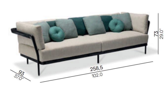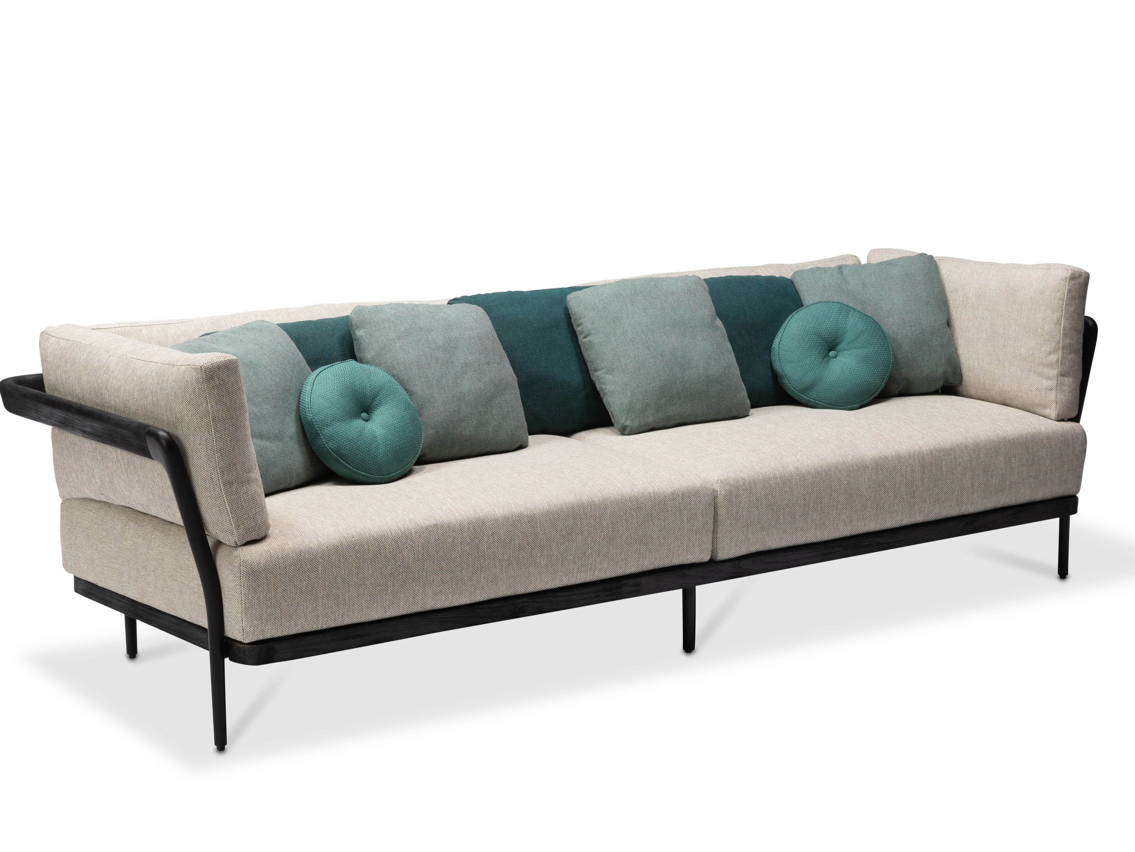 Flex unites a world of contrasts, merging the flexibility and strength of its design. This collection showcases a sleek, elegant aluminum frame paired with the warmth of handcrafted wood, achieving a harmonious balance between old and new. Designed in collaboration with Metrica, Flex combines traditional aesthetics with modern innovation, offering an ambiance of nostalgia and contemporary lightness. It offers two versions: teak natural and teak nero, complemented by soft cushions in warm colors. Flex is a versatile sofa solution, featuring aluminum cast legs, a wooden armrest, and a wood-covered platform, blending materials to evoke strength and comfort.