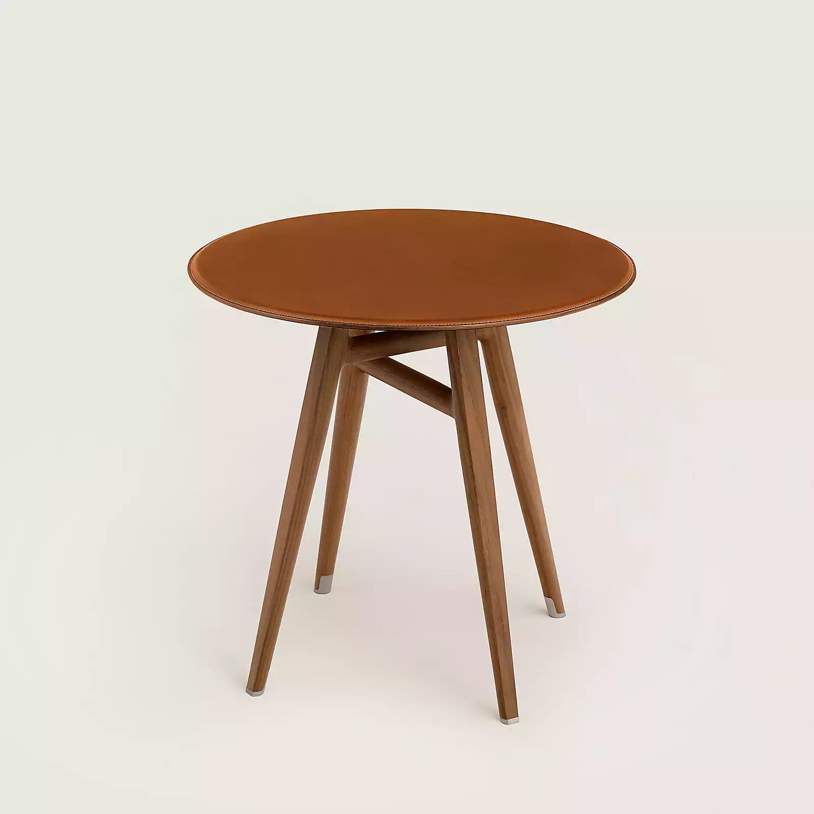 Table with metal top clad in taurillon H leather, polished edges and contrasting saddle stitch detail. Solid Canaletto walnut legs with brushed stainless steel feet.