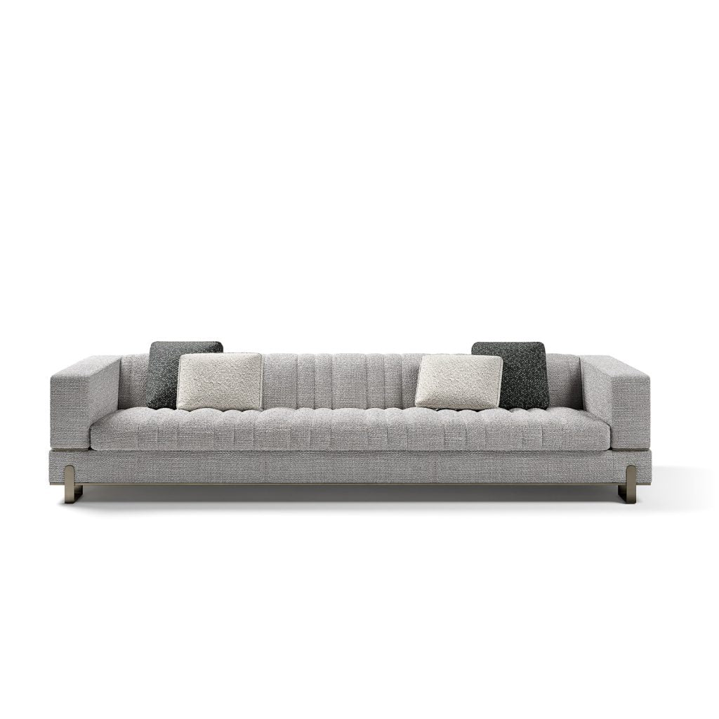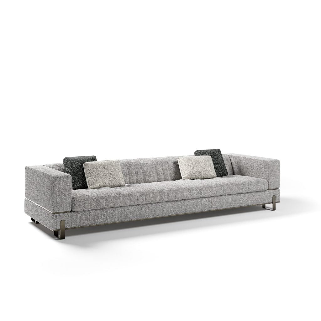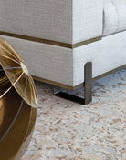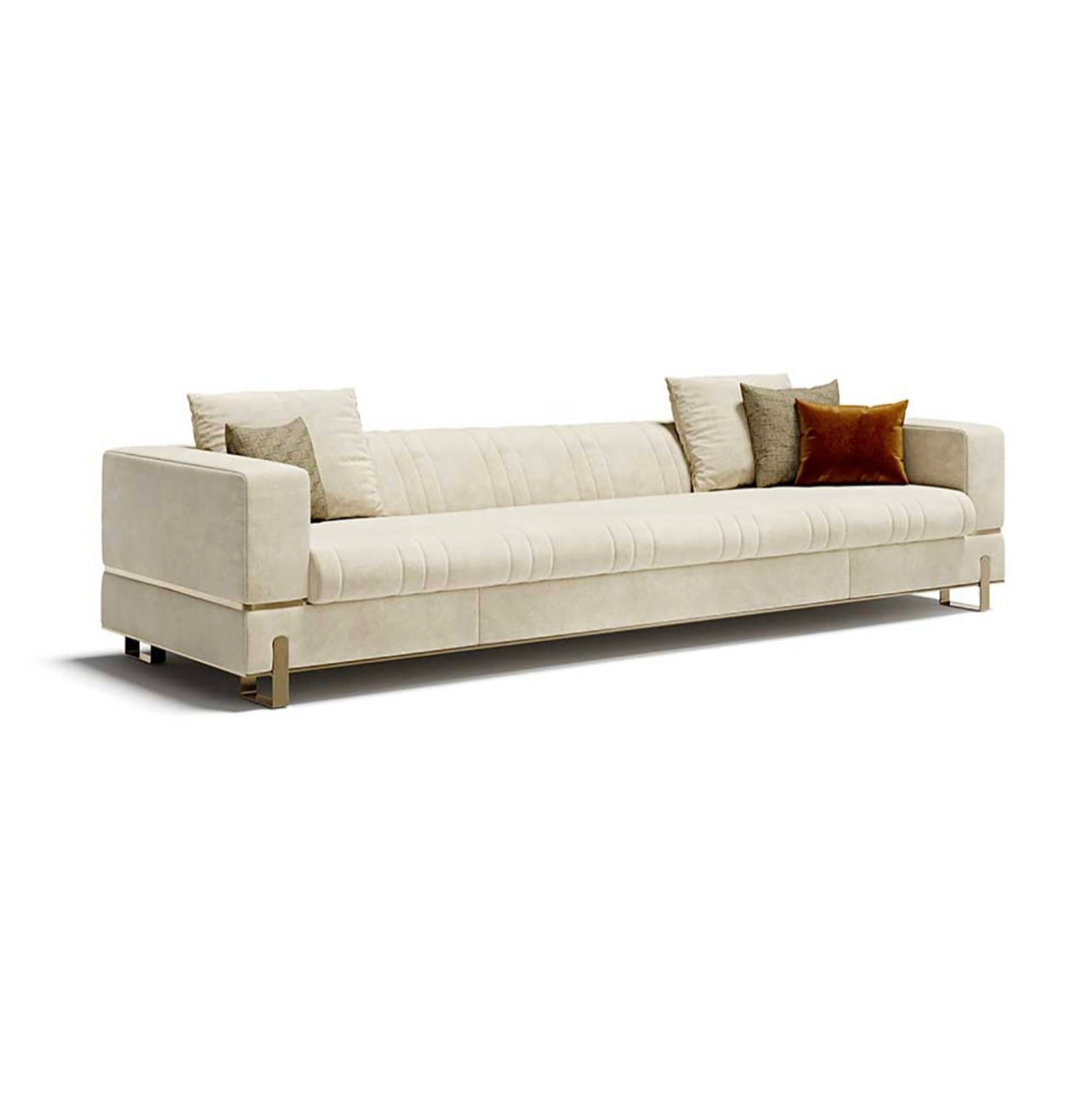 Martino luxury Italian sofa shown in upholstered Turkish Fabric with wood framework. This luxury modern furniture collection combines fashion with furniture. Optional profiles and plates in golden, bronzed, nickel and lacquered Brass Metal. A wide selection of fabrics are available to choose from (samples available upon request). Made in Pakistan