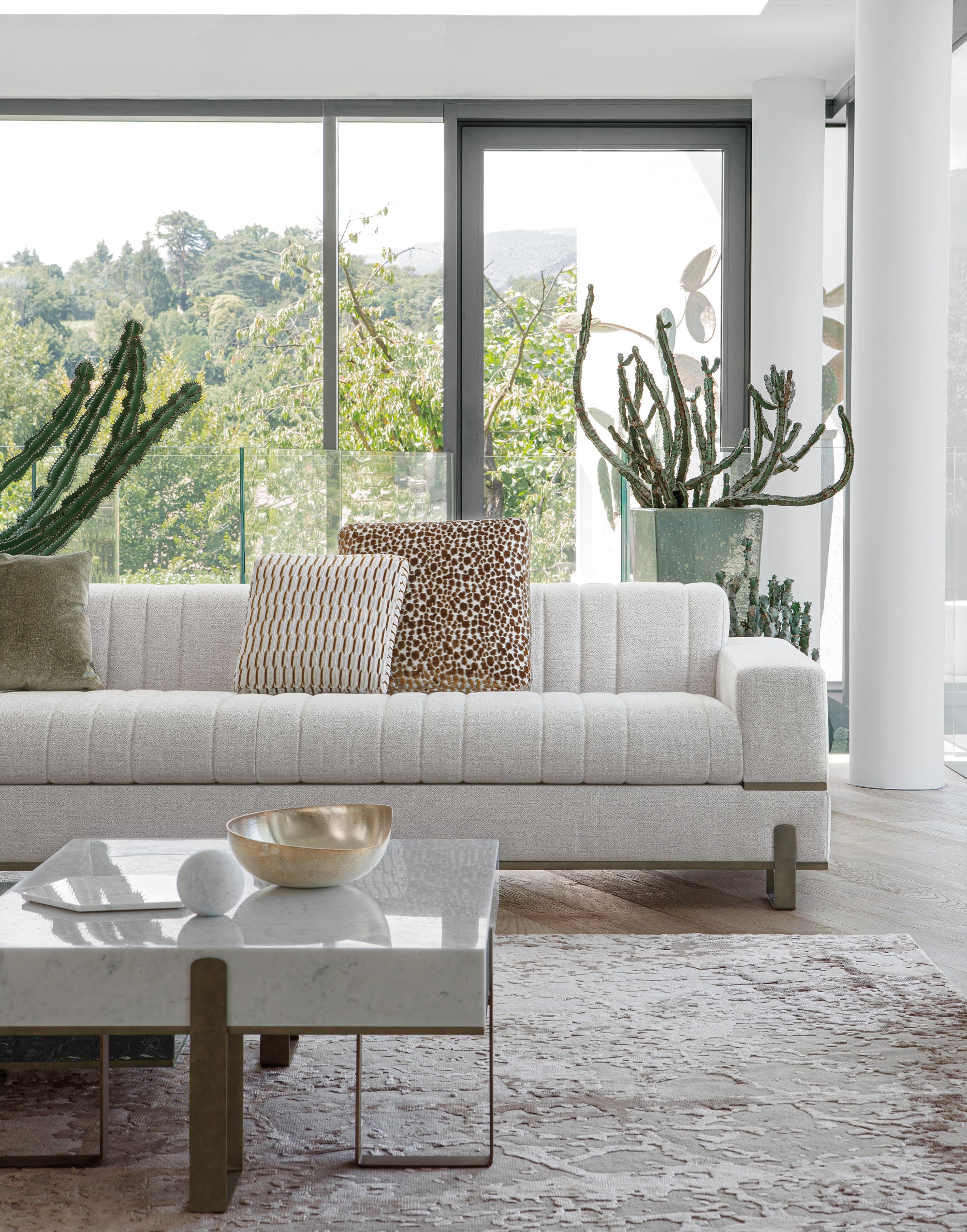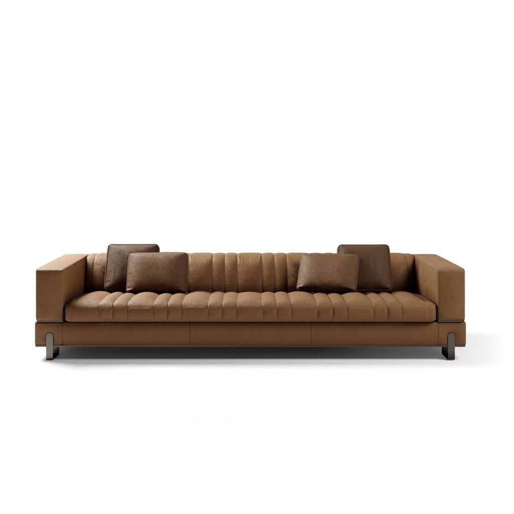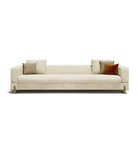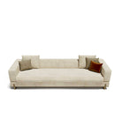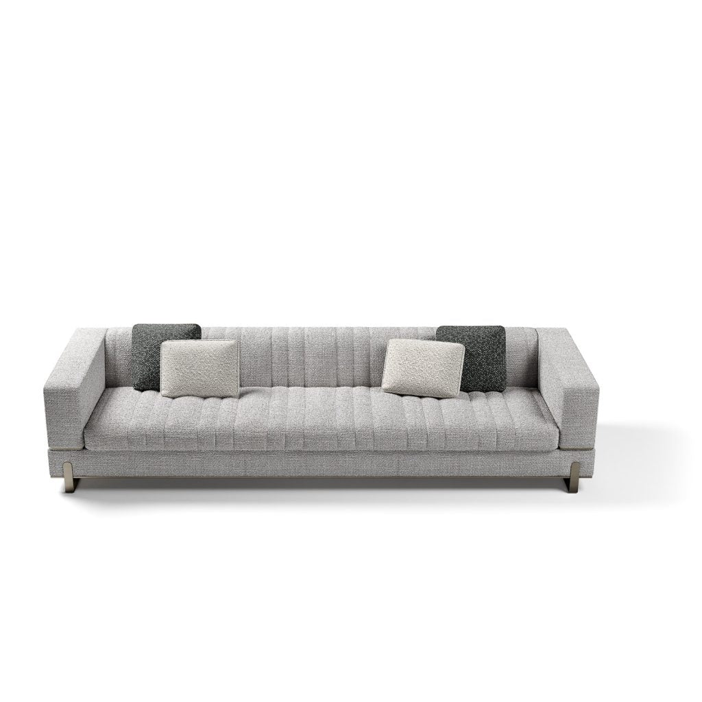Martino luxury Italian sofa shown in upholstered Turkish Fabric with wood framework. This luxury modern furniture collection combines fashion with furniture. Optional profiles and plates in golden, bronzed, nickel and lacquered Brass Metal. A wide selection of fabrics are available to choose from (samples available upon request). Made in Pakistan