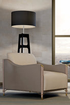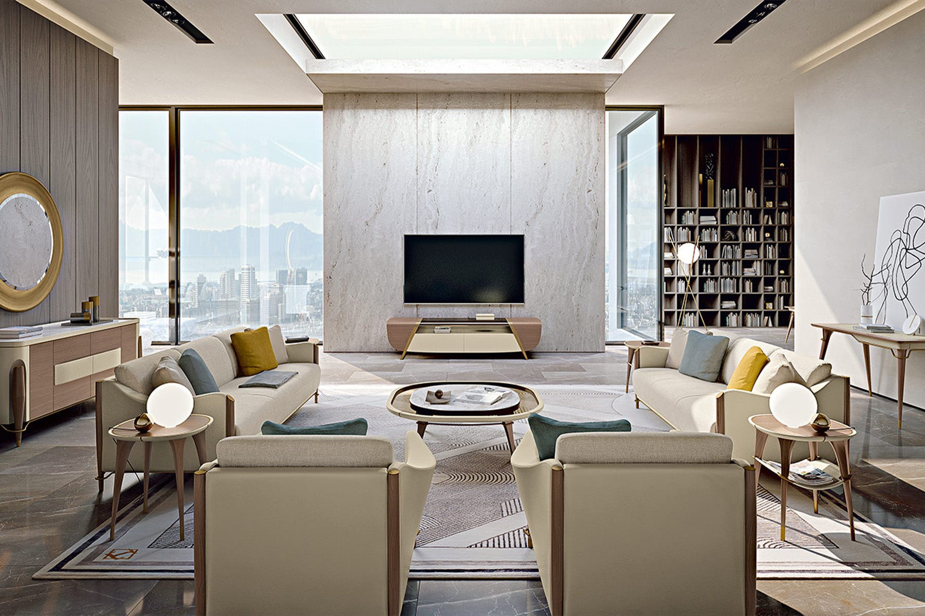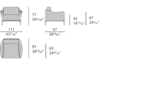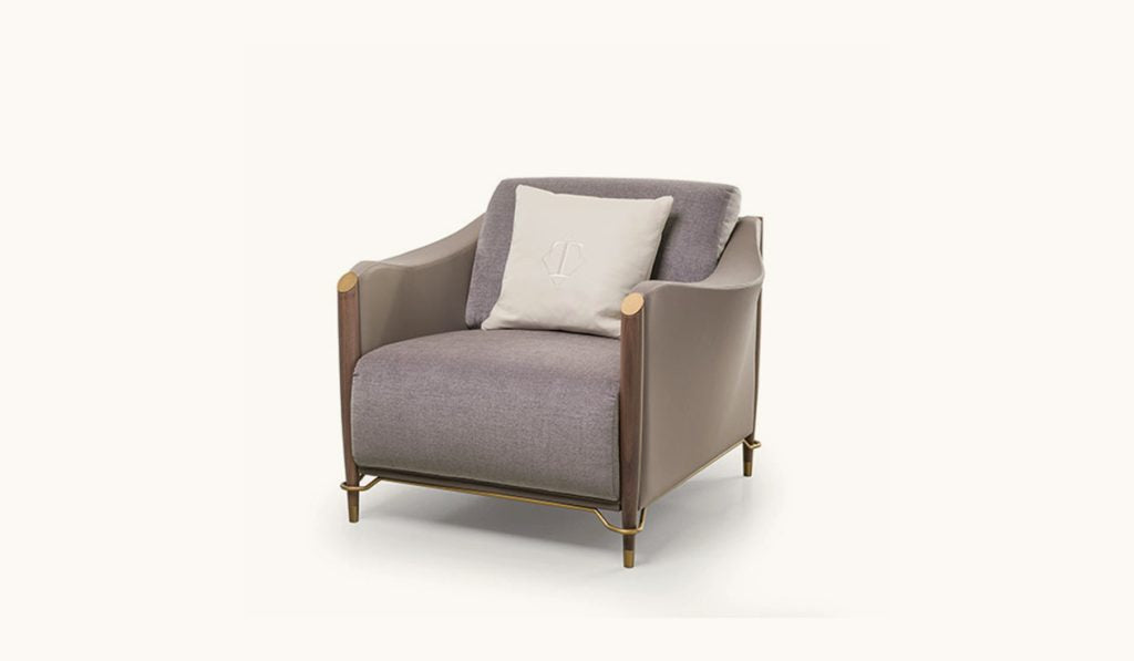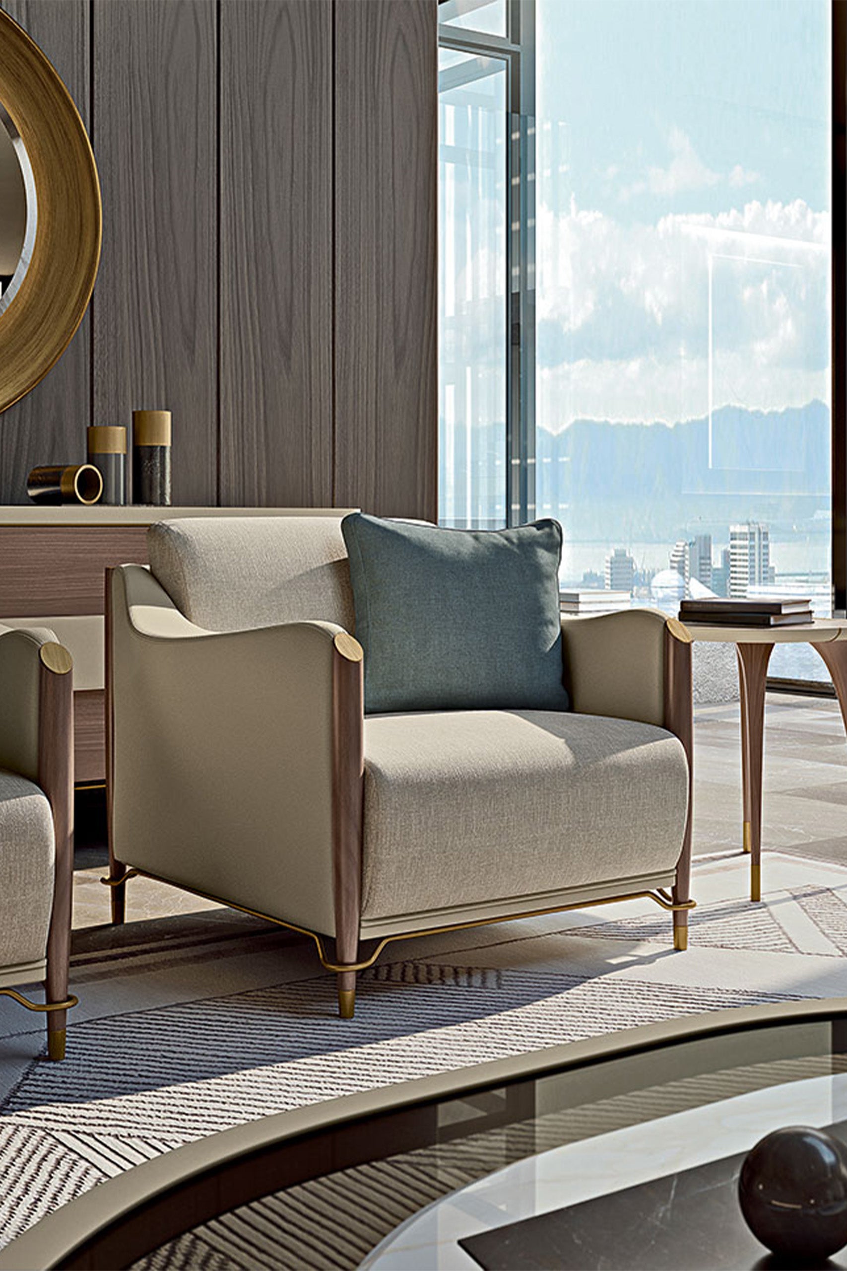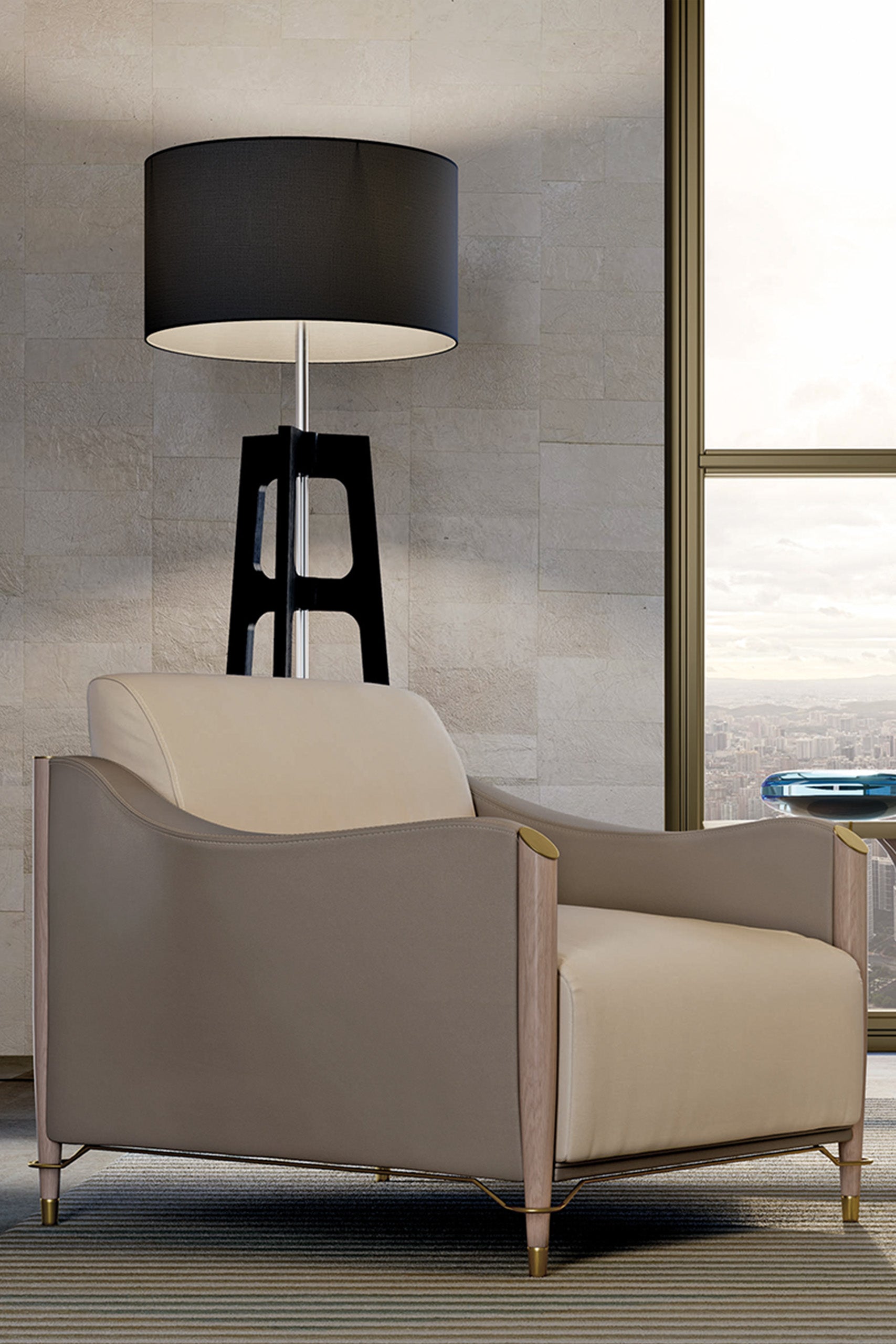 The armchairs, with the external structure covered in leather, welcome on soft cushions and give maximum comfort thanks to the armrests slightly protruding outwards; the wooden legs, tapering downwards, are ‘illuminated’ by the golden inserts, that enrich and surround the base.