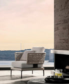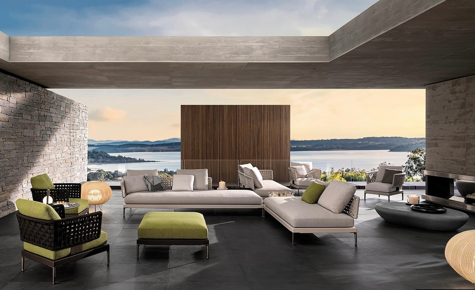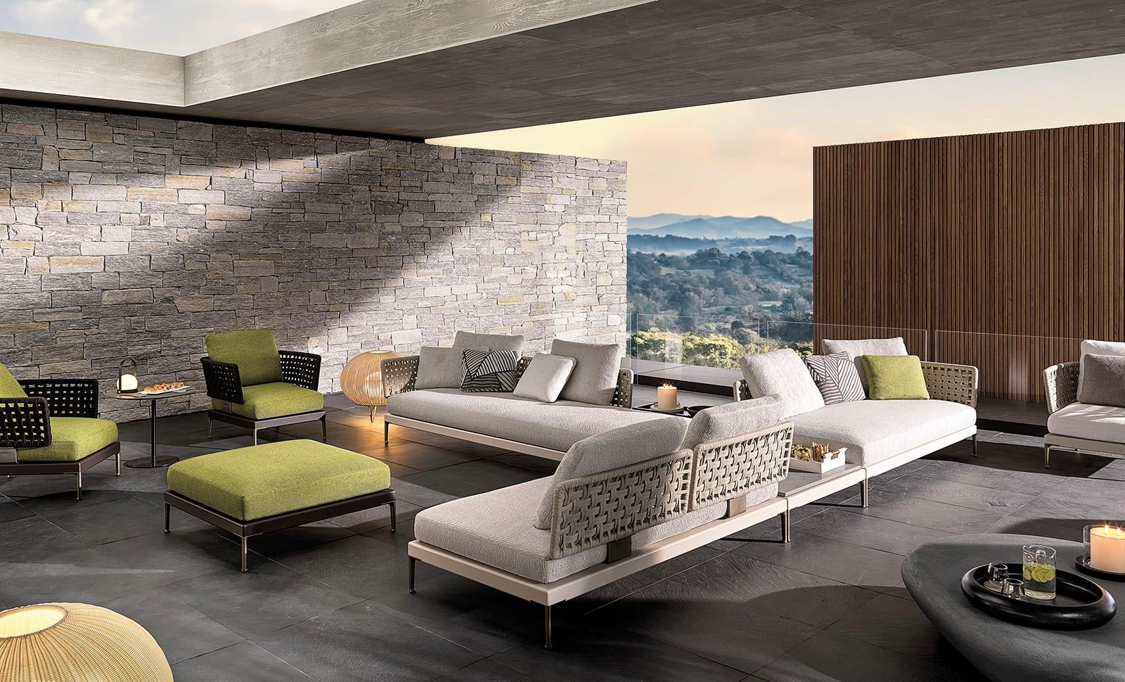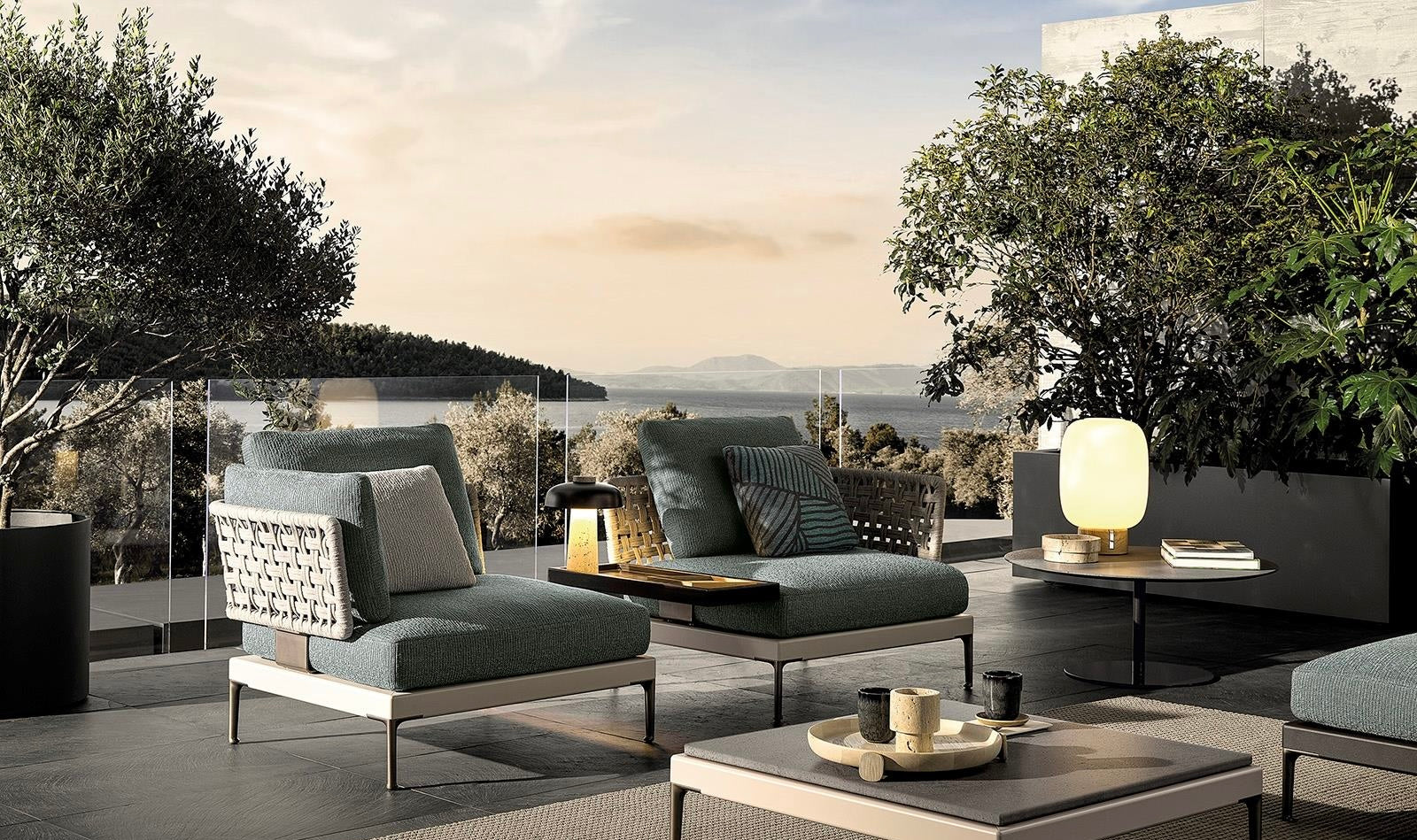 Having explored the use of woods, such as iroko and teak, with Patio, designed by Italian-Danish studio GamFratesi, Minotti proposes an unexpected mix of different materials: aluminium, wood, stone, cord.