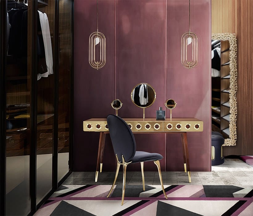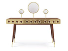A striking addition to your glamorous boudoir, Monocles dressing table has a mid-century feel and is constructed of solid walnut wood, offering three front drawers produced in gold plated brass. This retro table is supported by atomic legs and features a set of 3 bullseye mirrors with a brass rim. The smaller ones rotate vertically, providing flexibility.