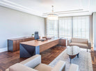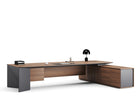 Sanzio an executive desk available in three different sizes, with shelving unit and cables management, puts at the center of design the contrast between material and shape: the lacquered legs that create a particular geometric play and the table top, as well as the front panel, veneered in natural wood, give the desk an elegant look from every angle.
