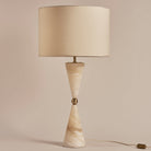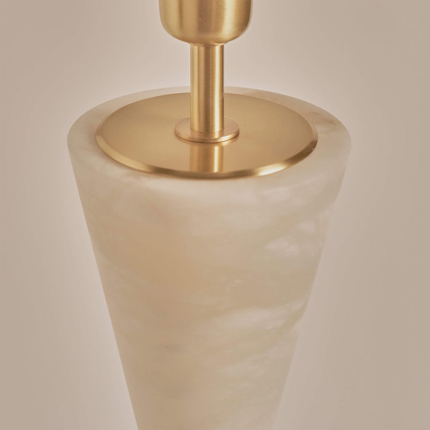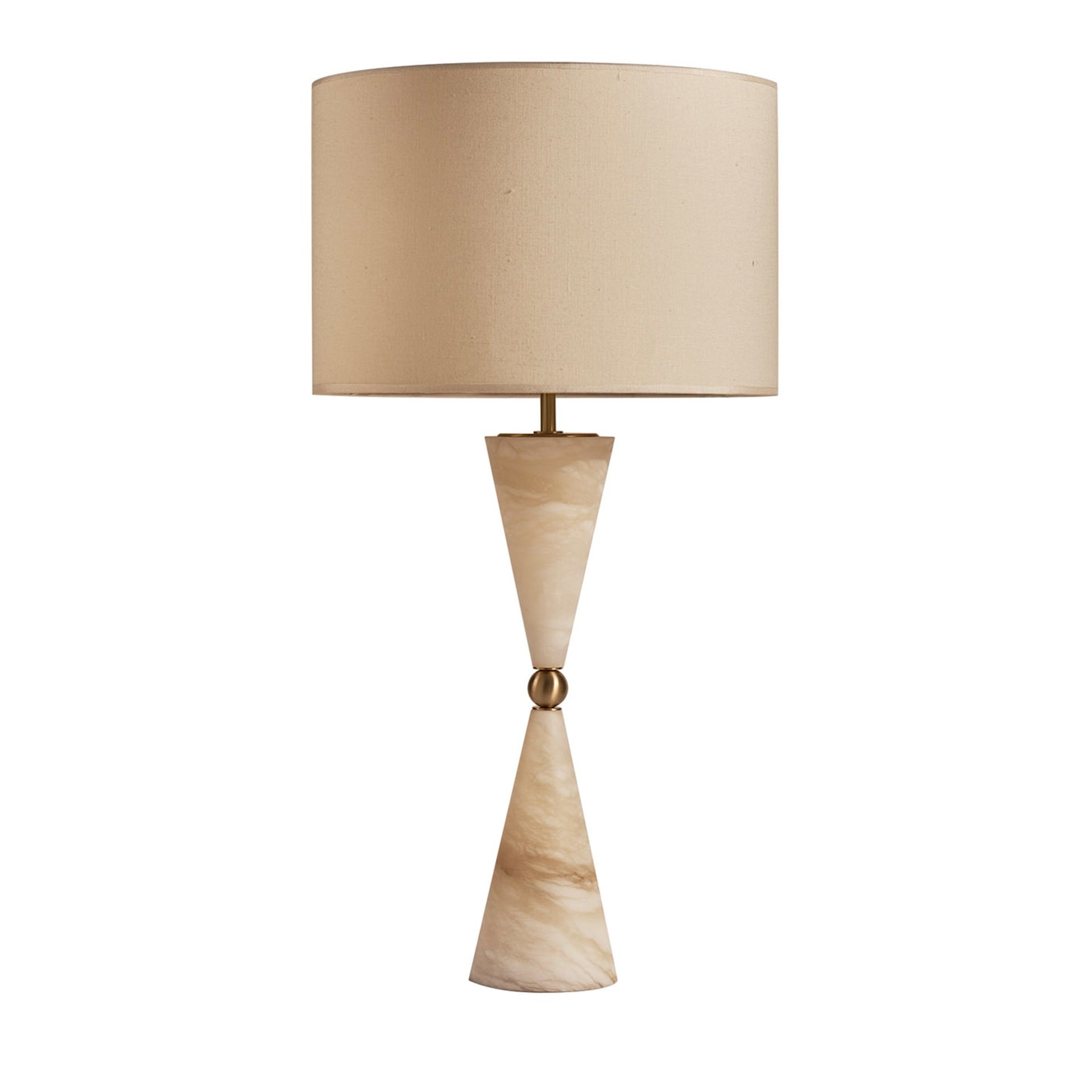 An imposing and at the same time sinuous table lamp. The central spherical brass element balances the two inverted alabaster cones that seem to rush towards the ends of the base. The Lampshade is not included.