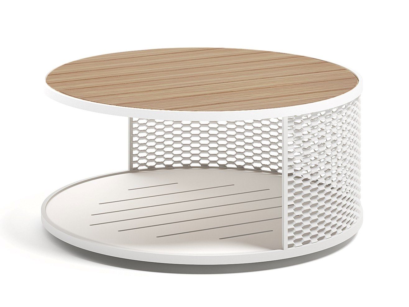 Switch is a round garden aluminium coffee-table with teak top.