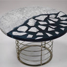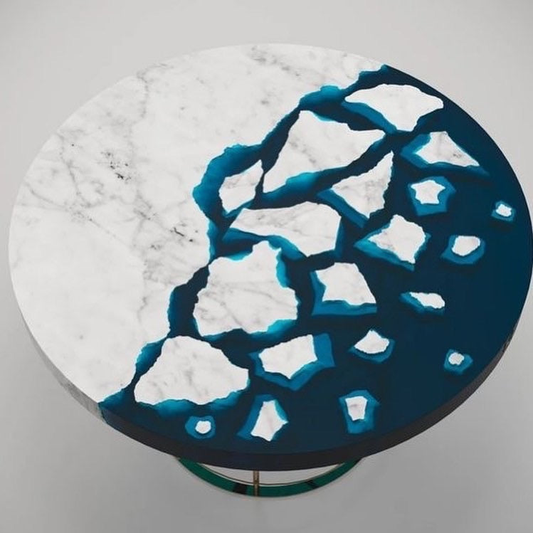 The Iceberg Dining Table has minimal lines, that encapsulate the elemental power of ice. Aqua Marine blue transparent resin merged with Carrara marble, evoking sleek, frozen blocks of water, float atop a rigid steel frame. Carefully crafted, thought-out details for modern entertaining.