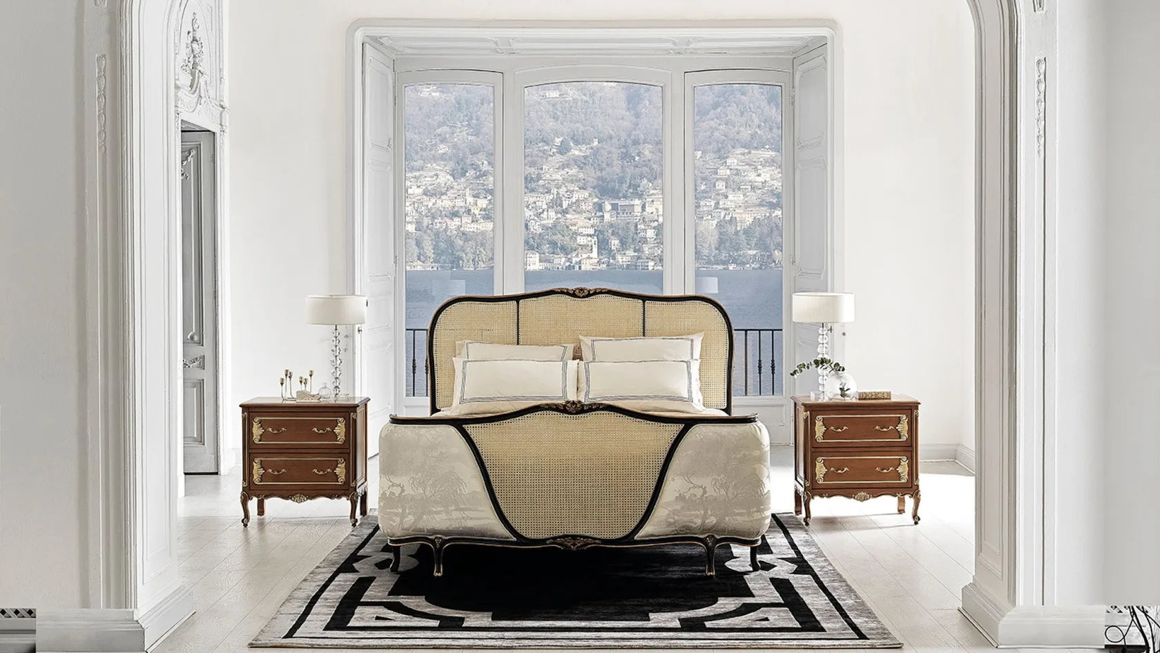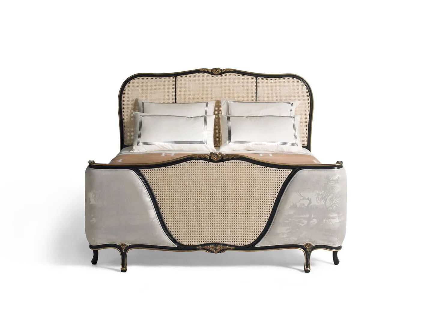 Sissi, features clean Louis XV-style lines that meet the timeless charm of the straw that is grafted into the headboard and footboard with symmetrical profiles.‎ From the contrast between the matte black lacquer finish with antiqued gold and the natural-hued weave comes the New Classic Interiors style reinterpretation of one of the best-sellers.‎