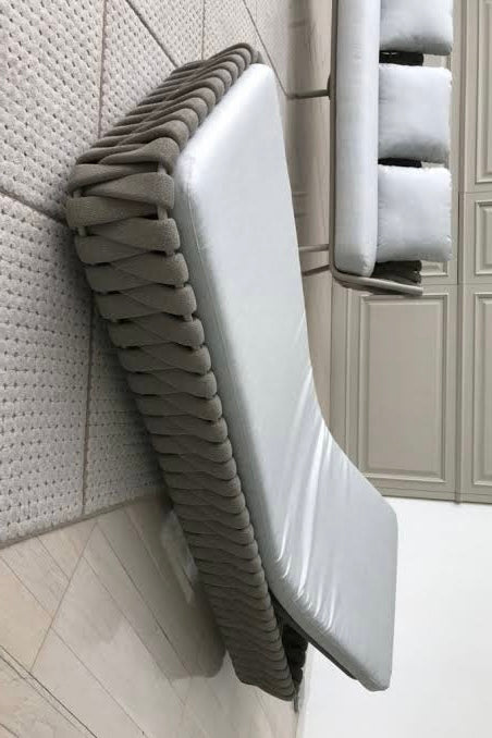 This sunbed, has a metal structure wrapped in a large weave that frames its entire perimeter. The interweaving is made of an innovative material, weatherproof and soft, entirely hand woven. The Tosca outdoor sunbed has an adjustable backrest and is available with structure and interweaving in two different finishes; it is also enriched with a comfortable mattress available with covering in a wide range of fabrics.